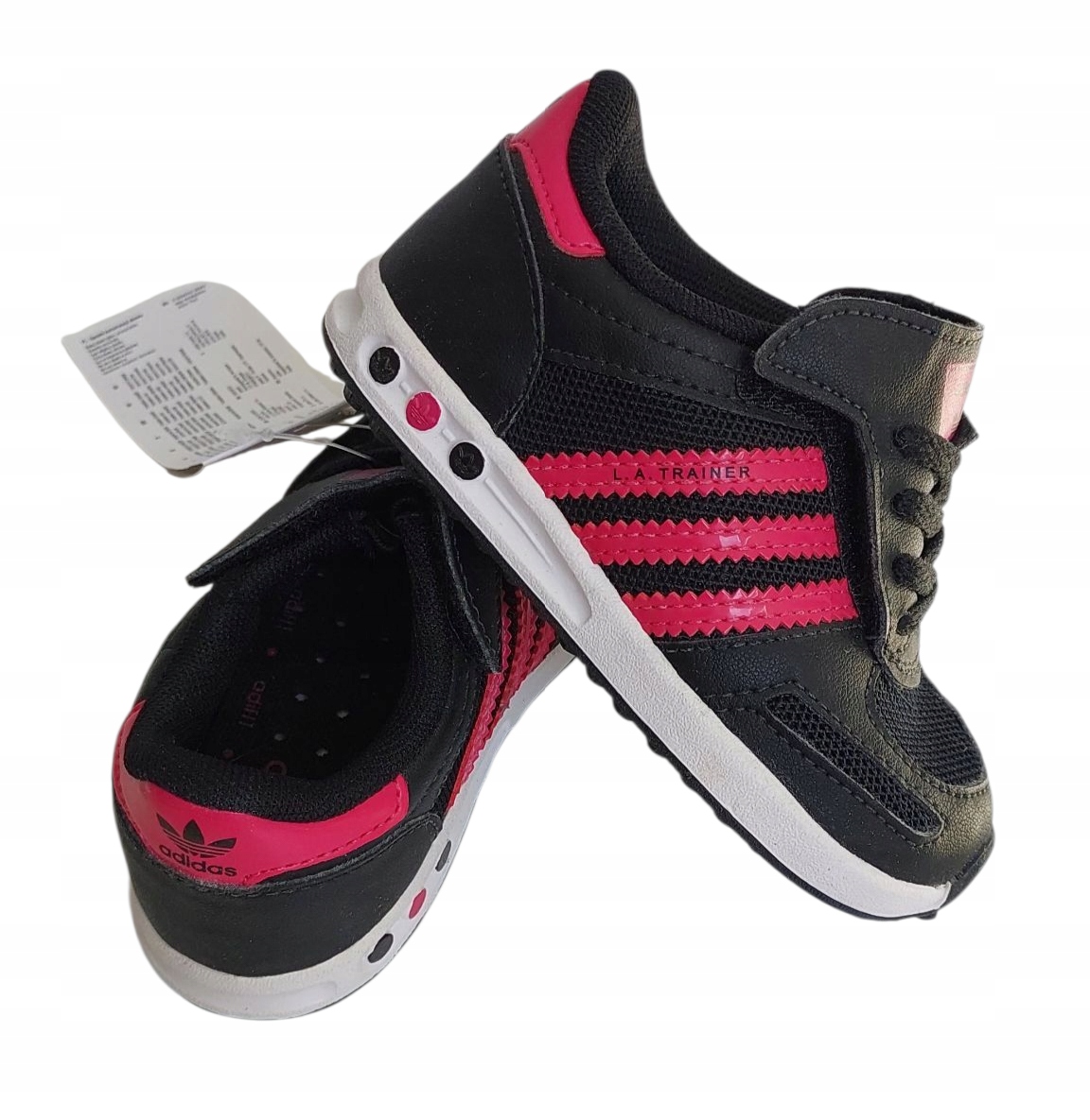 Нові оригінальні дитячі взуття Adidas Originals. Чорний з рожевим. Взуття увійшло на язик, на п'яті та на підошві. Три рожеві смуги з обох боків взуття. Взуття на липучках з широкою гнучкою еластичною смугою під язиком. Дихаюче взуття, повітряне панель. Не -скалові підошви. Adifit Inserts. Взуття без коробки.
