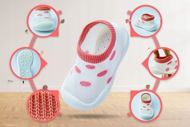Черевики/шкарпетки проти ковзання — це ідеальне поєднання комфорту, безпеки та милого зовнішнього вигляду. Міцна гумова підошва, дихаючий верх і адаптація до рухів ніг роблять його відмінним вибором для малюків, які роблять перші кроки.