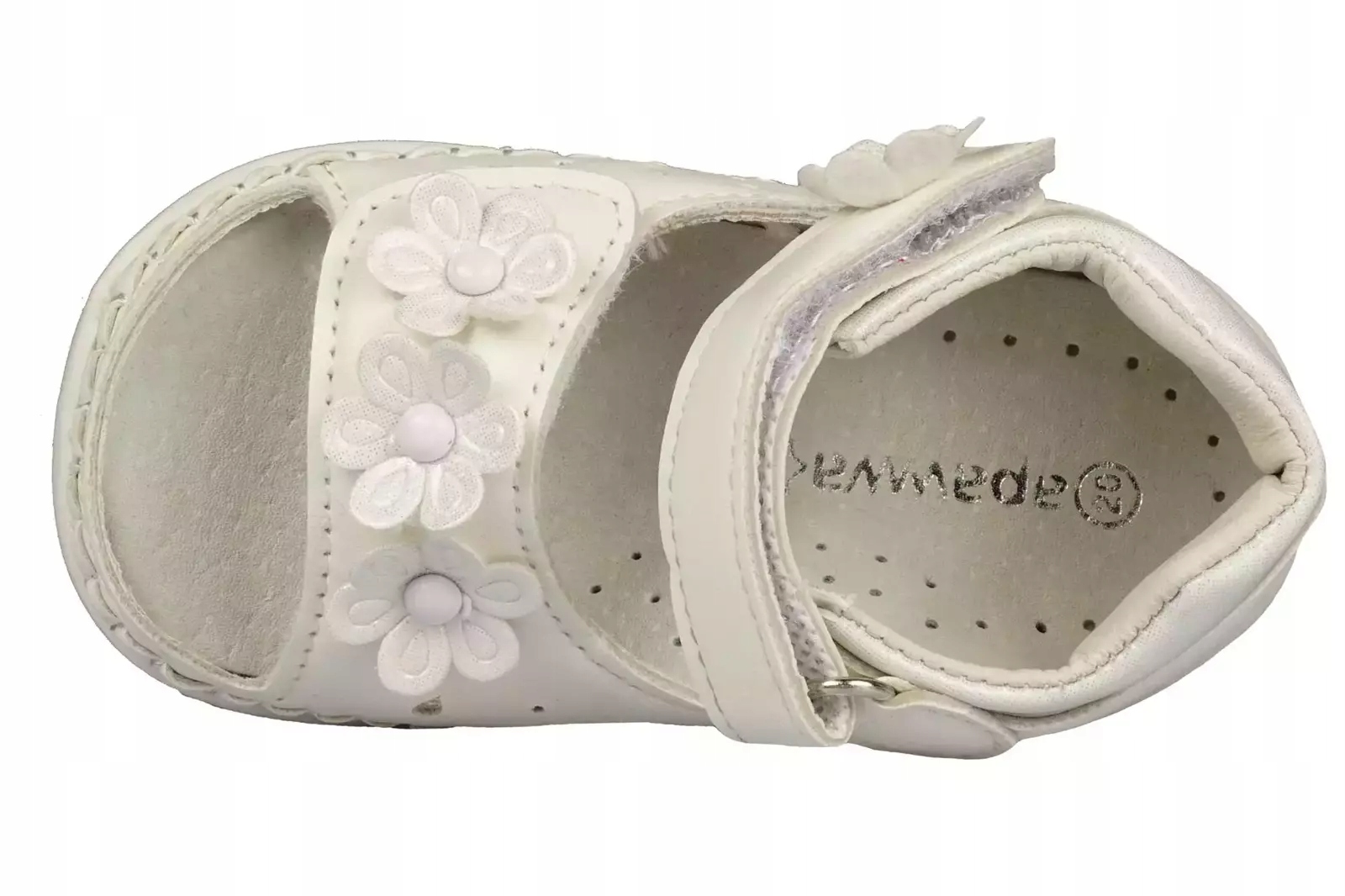 Дитячі босоніжки Apawwaбілого кольору з гарним декором спереду. Виготовлені з якісної екологічної шкіри, яка запобігає подразненню. Всередині вони оснащені профільованою вставкою з натуральної шкіри, що підвищує комфорт під час використання та дозволяє правильно розвивати стопу дитини. Босоніжки мають застібку-липучку, тому їх можна ідеально відрегулювати відповідно до ваших уподобань. Gзвичайні підошви запобігають ковзанню, а також є досить гнучкими. Ця модель ідеально підійде для повсякденного використання в сезон ледачих, вона має нарощену п'яту і відкритий носок.