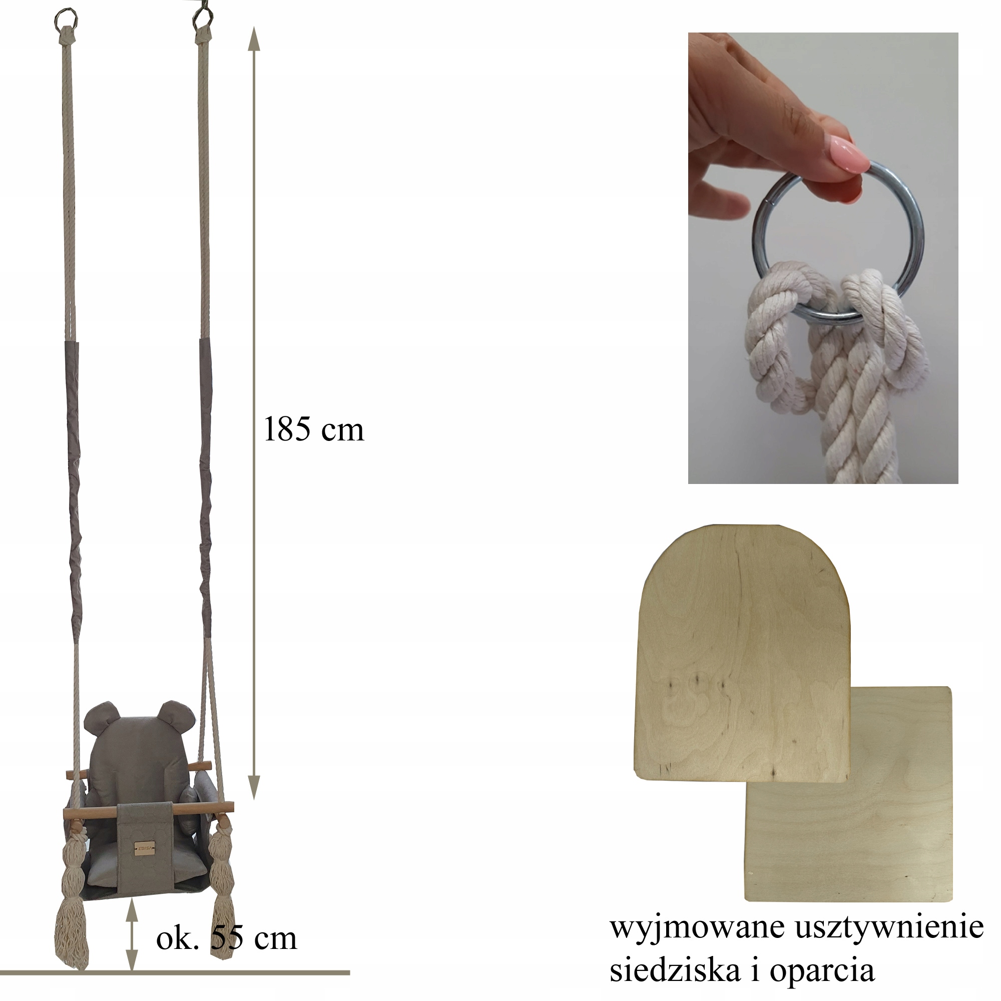 Крім очевидних переваг, гойдалки стануть гарним декоративним елементом будь-якої кімнати. Кожна гойдалка має два мотузкових покриття. Заколисування допомагає заспокоїти дитину, а також дуже позитивно впливає на розвиток рівноваги та координації рухів. Ідеальний продукт як подарунок на день народження чи хрещення.