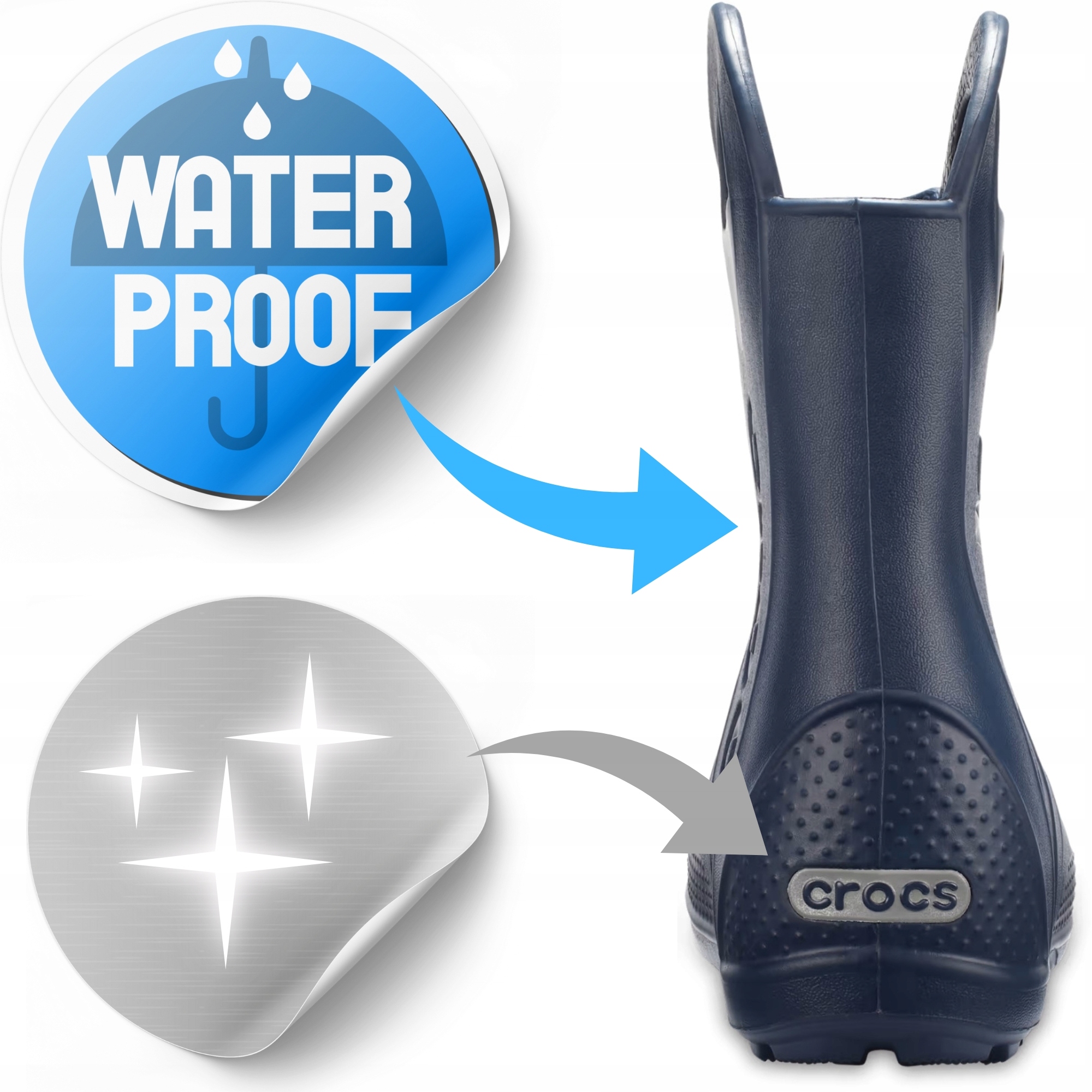 ⭐️ Завдяки використаному матеріалу черевики Crocs Wellington абсолютно водонепроникні. Вони не пропускають воду, що дозволяє дітям вільно стрибати в калюжах, не ризикуючи промочити ноги.