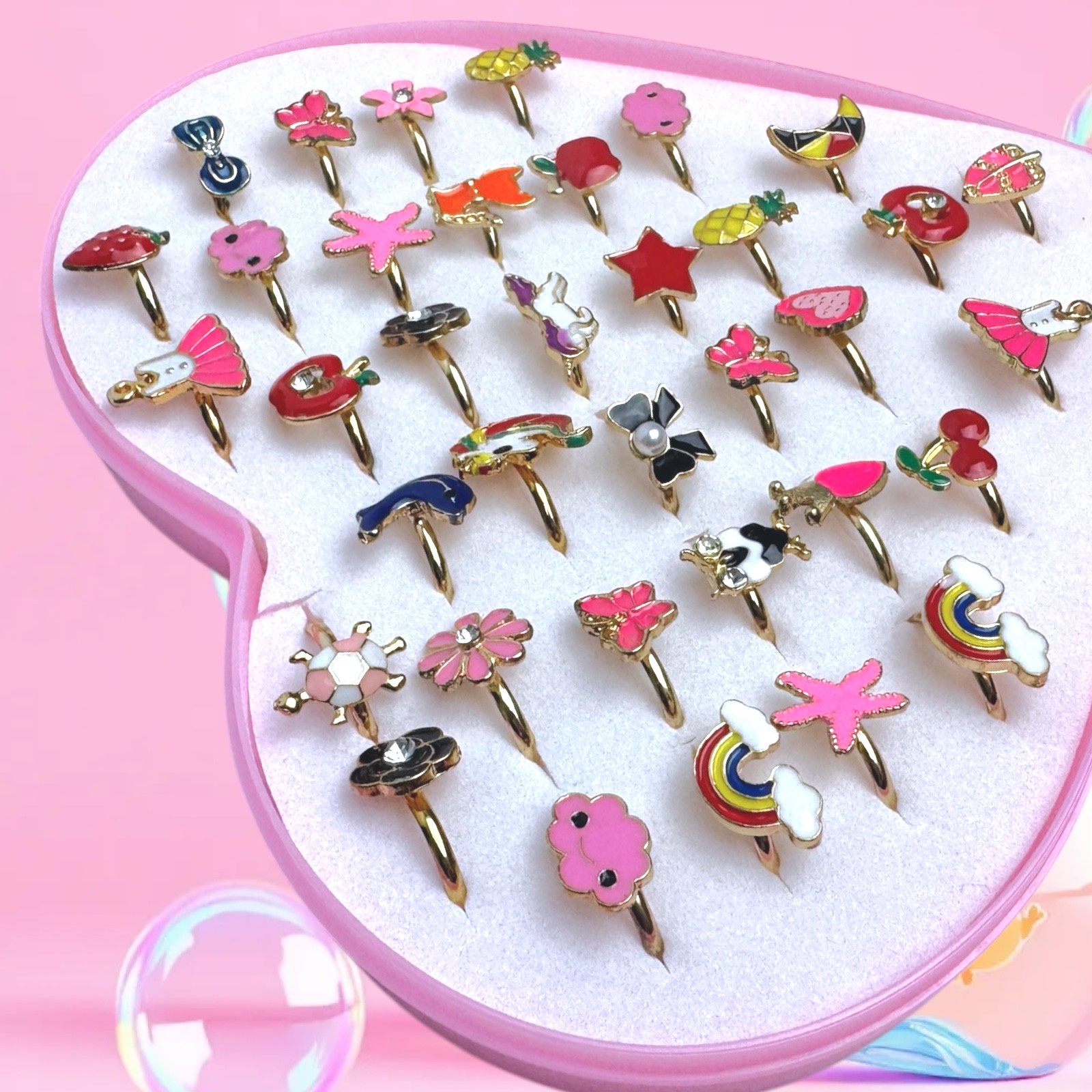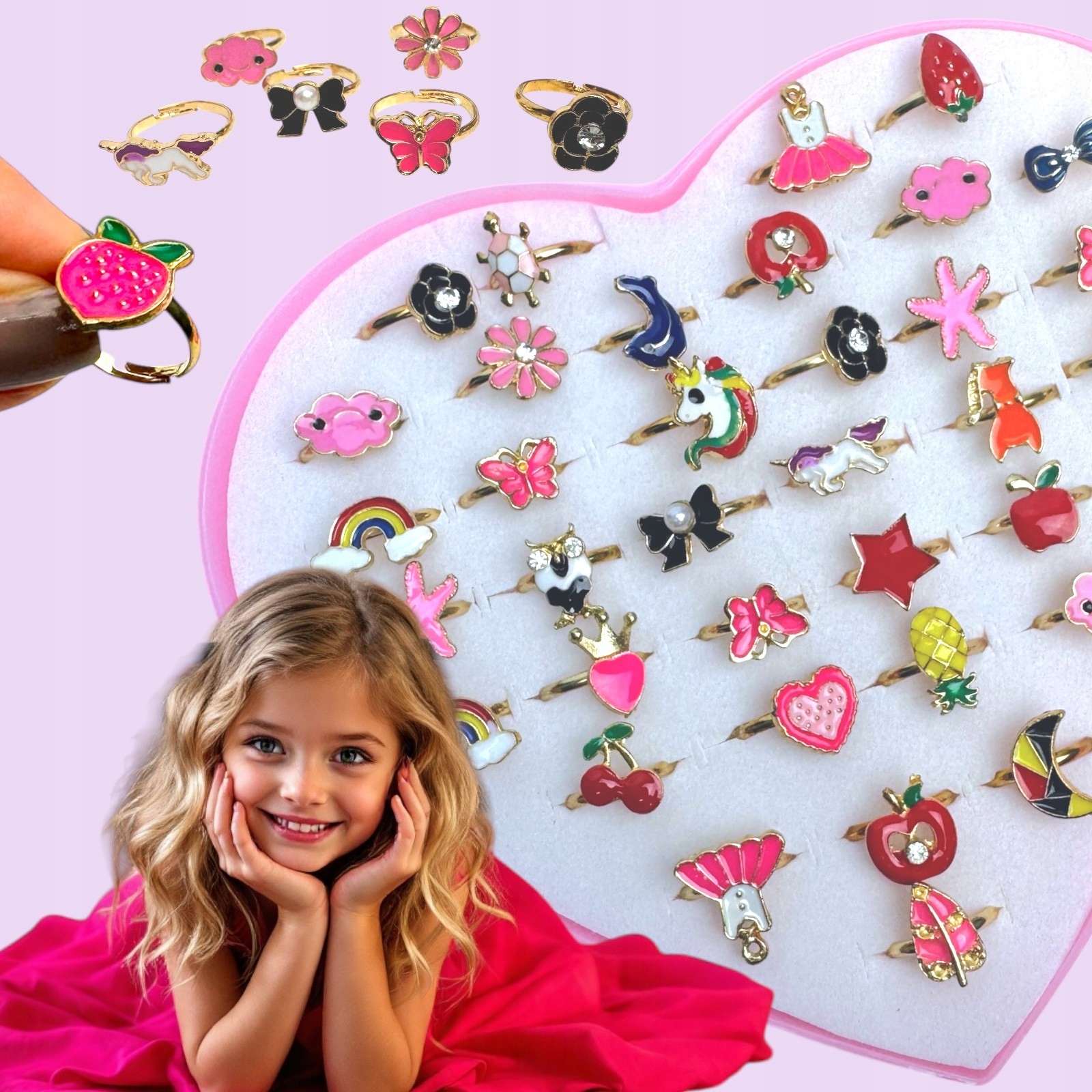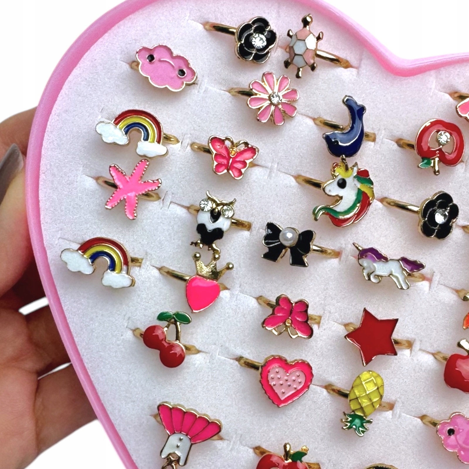 Чудовий набір з 36 кілець для дітей - ідеальний вибір для маленького любителя дрібничок! Кожне кільце має регульований розмір, завдяки якому воно адаптується до різних пальців і росте з дитиною.