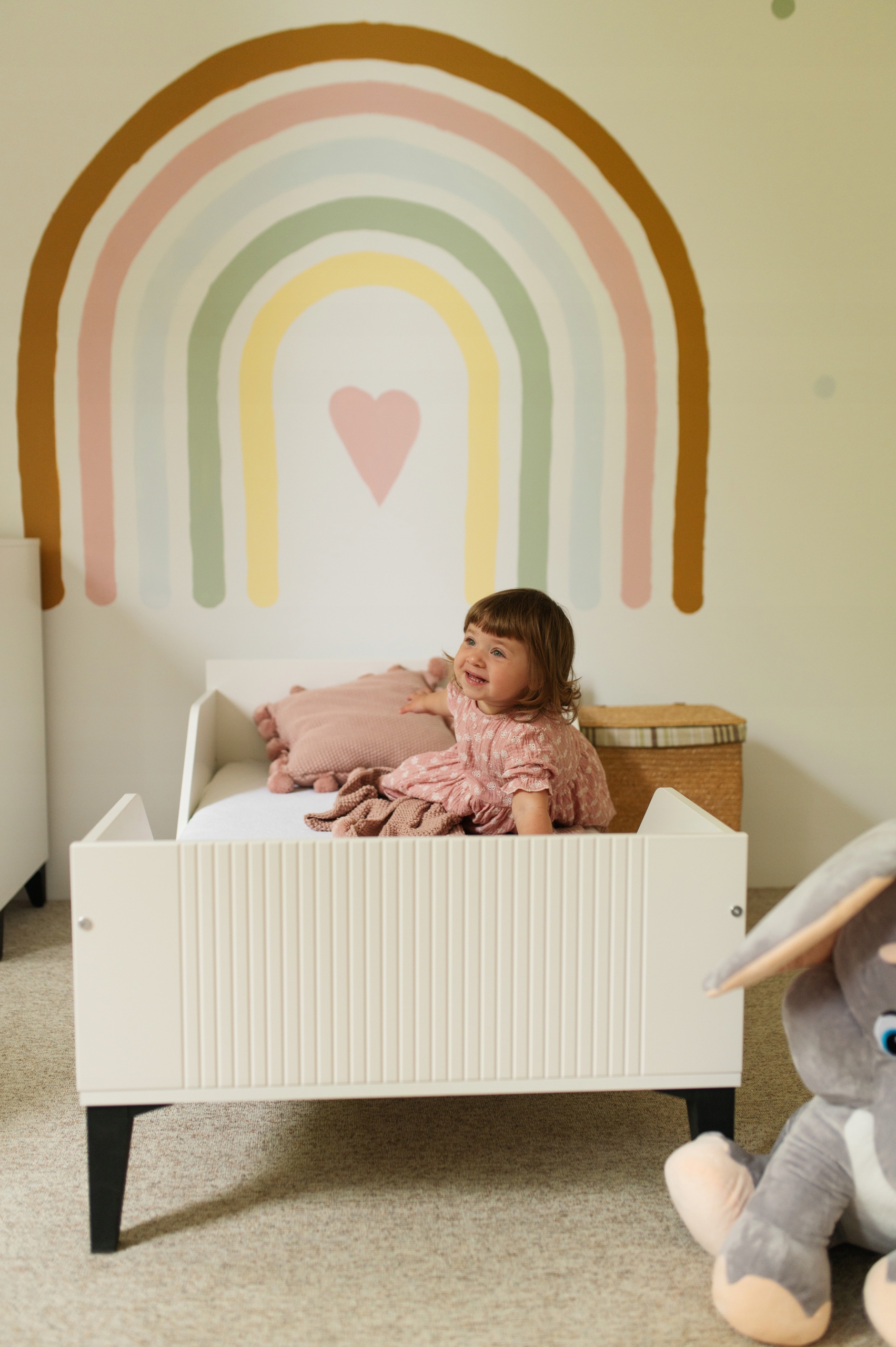 color: білий👉 подрібнена вершина ліжка 140 × 70 МІВ у білому вражає елегантністю та найвищою якістю виготовлення. Прекрасний малюнок ламелів та чорних аксесуарів - це позачасова комбінація, яка відповідає будь -якому інтер’єру. Піки ліжки виготовлені з високоякісної MDF, яка характеризується винятковою міцністю. Після видалення високих сторін та встановлення захисних бар'єрів, які знаходяться в наборі, ви можете легко перетворити ліжечко на диван для більшої дитини.