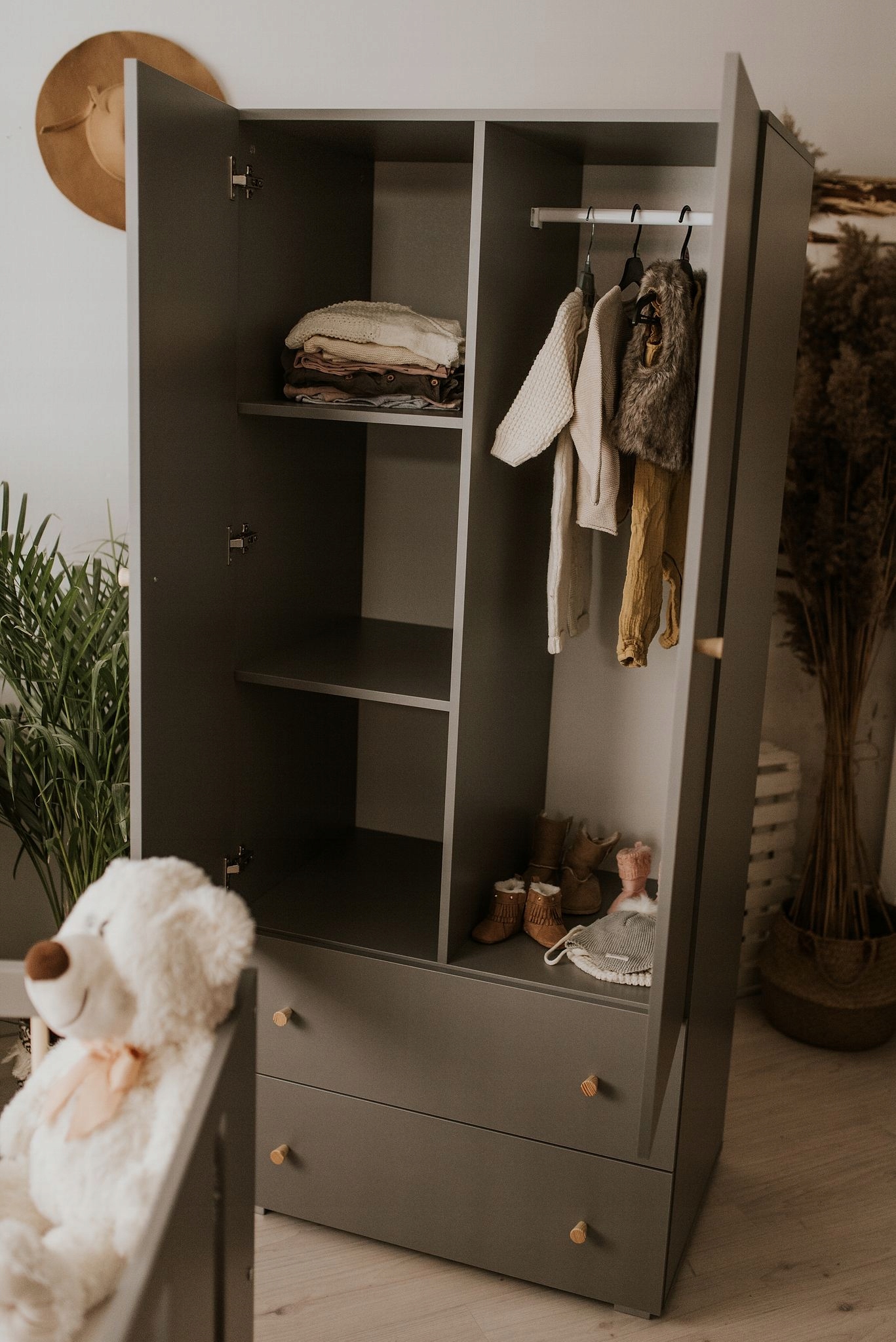 Вимкнено, стильні меблі стають все більш популярними. Двоєдійний графітовий гардероб для дитячої кімнати також може використовуватися в молодіжному інтер’єрі. Гардероб просторий і зручний - у нього є палиця, ящики та полиці.