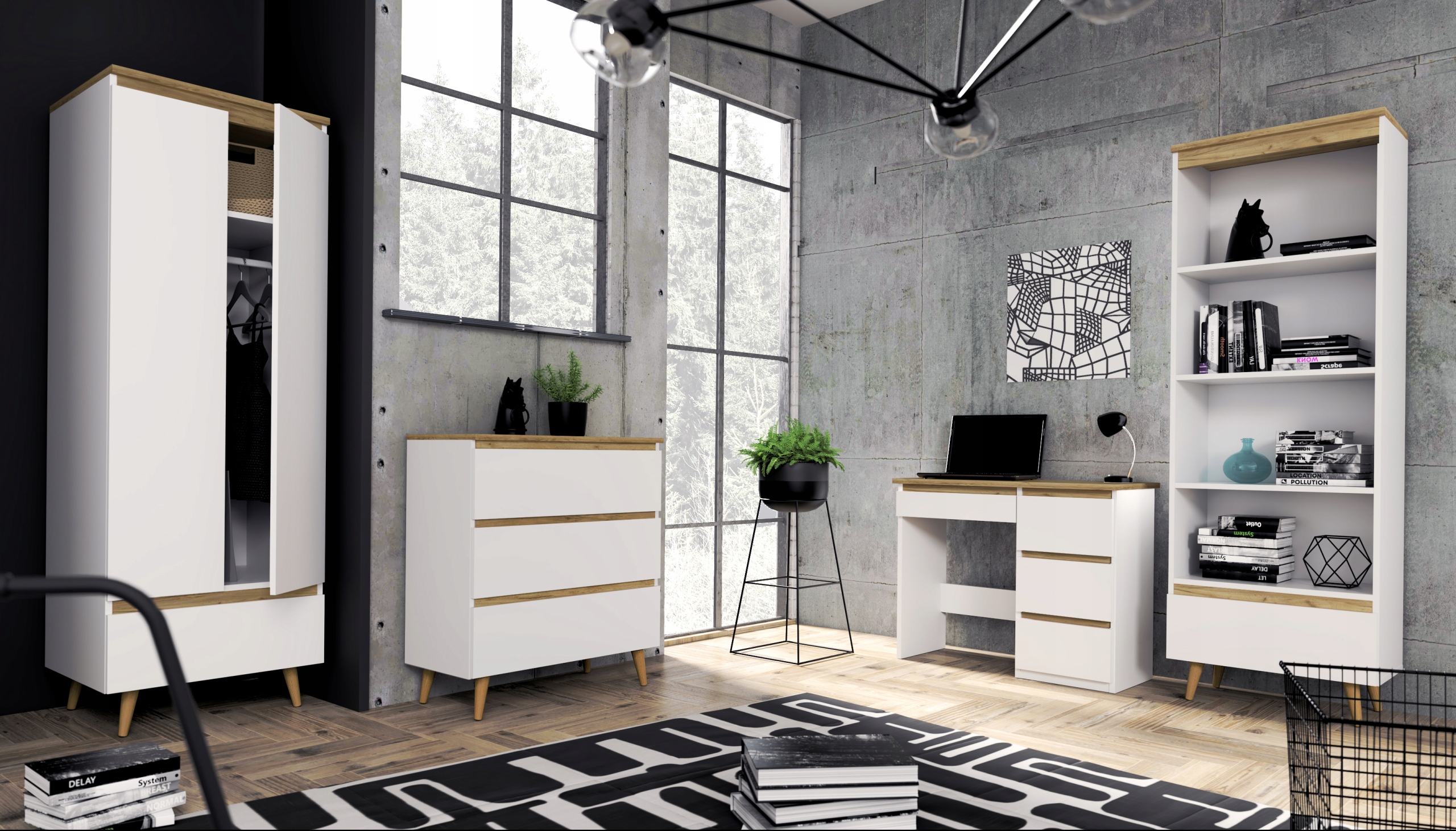 Система Norge – це простота та елегантність, використання арктичного білого та теплого крафтового дуба, що є ідеальним поєднанням. Меблі з цієї колекції встановлені на ніжках з натурального бука, просочених маслом.