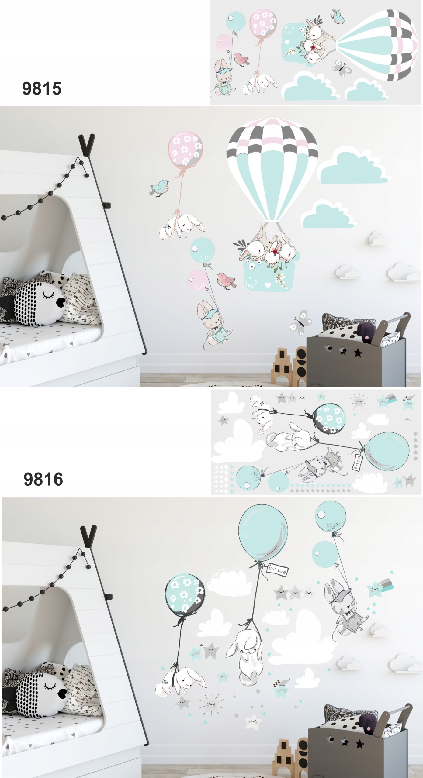 дитячі наклейки на стіну кролики повітряні кулі зверху