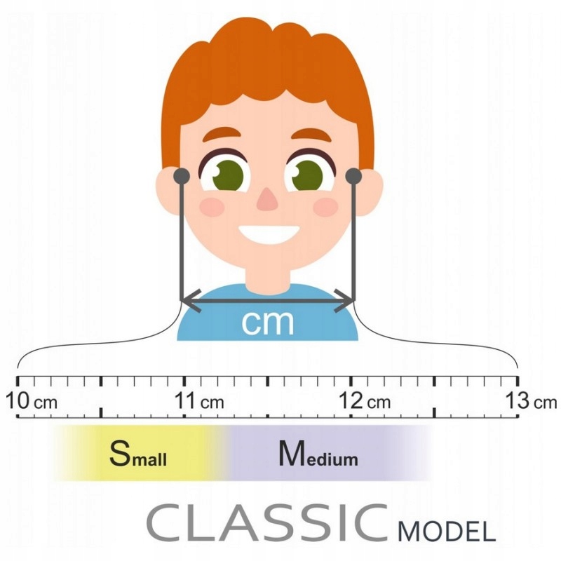 - Вони бувають двох універсальних розмірів: Small(рекомендований вік: 0-3 роки) та Medium(рекомендований вік : 3-7 років). Розмір підбирається індивідуально під голову дитини.