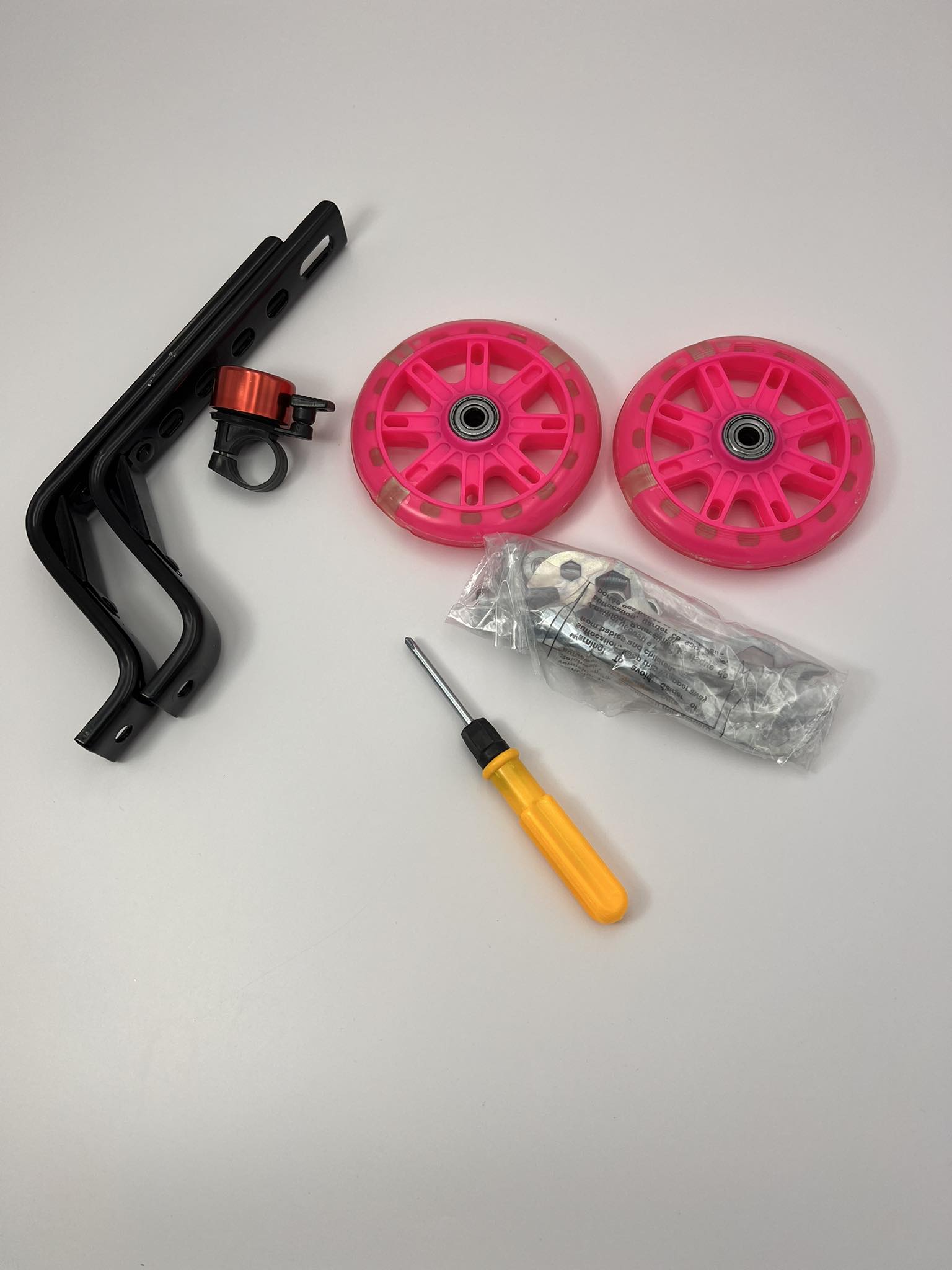- Просте складання - 2 x вертикальні монтажні кронштейни, 2 x колеса, 4 x гайки (2 запасні гайки), 1 x викрутка, 1 x ріжковий ключ, 1 х дзвін велосипед. Ідіть і насолоджуйтеся першою вправою вашої дитини на велосипеді просто неба.