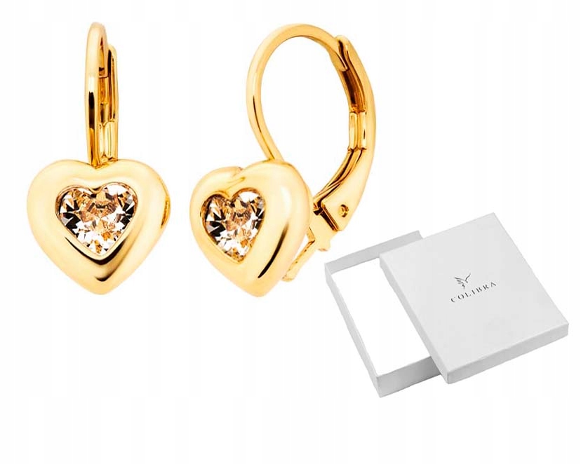 Золоті сережки-сердечка відColibra, вручну прикрашені кристалізованими кристалами Swarovski, виготовлені з ювелірного сплаву з незмінним позолотою 24-каратним золотом , відповідно до найвищого ювелірного мистецтва та уваги до деталей, вони мають оригінальні ярлики компанії.