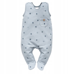 Дитячі повзунки з колекції Charlie виготовлені з ніжної бавовни з домішкою еластану. Завдяки додаванню еластану одяг краще сидить на дитині та полегшує одягання дитини. Матеріал сталево-блакитного кольору, прикрашений незмінним діамантовим принтом. З лівого боку кишеня на елегантному ґудзику під дерево. Виріз повзунків і застібки оброблені делікатною обробкою, спеціально підібраною під колір матеріалу. Завдяки цьому дитина після одягання виглядає красиво і при цьому почувається комфортно. Поверх п'ят вшиті спеціальні гумки, щоб під час повсякденних справ стопи не вислизали з гомілок. Ластовица в промежині забезпечує комфорт для дитини під час носіння, а також дозволяє легко помістити підгузок. Крім того, повзунки застібаються на зручні застібки на плечах і в промежині, що дозволяє дуже легко міняти підгузник. Дитячі повзунки є невід'ємним елементом дитячого ліжка. Вони створять елегантний комплект з каптаном або боді з цієї ж колекції. Про них варто пам'ятати, комплектуючи гардероб для малюка. Спальники виготовлені в Польщі і мають сертифікат "Безпечні для дітей". На фото зріст моделі 74 см, одяг 74 розміру.