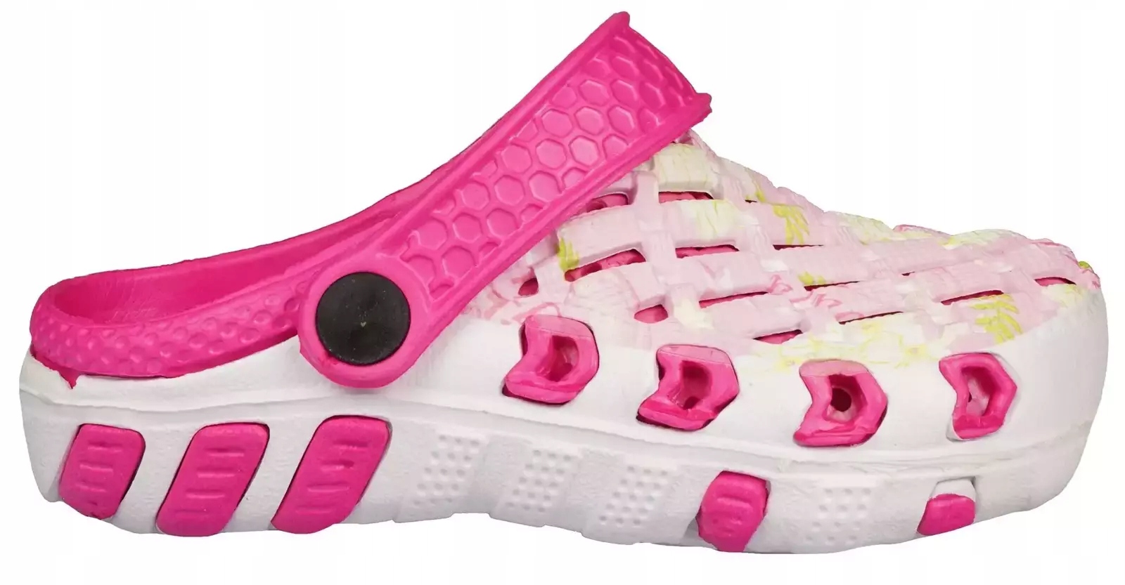 Дитячі шльопанці для басейну ЕМАКС типу Крокс, білі з рожевою фурнітурою. Вони створені в хлоп'ячому стилі з надзвичайно м'якою піною, яка не викликає роздратування. Забезпечує максимальний комфорт під час використання та ідеально адаптується до стопи. Цей матеріал гнучкий, легкий і водонепроникний. Ця модель має ремінець, який можна розташувати як на п'яті, так і на передній частині взуття. Закритий носок має отвори, які забезпечують відмінну вентиляцію, а протекторна підошва захищає від ковзання. Дитячі тапочки EMAKS ідеально підходять для повсякденного використання, підходять для саду, ділянки, басейну, у відпустку або домашнього використання.