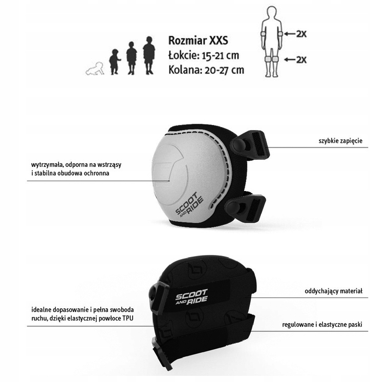 Скут та проїзд захисників на ліктях та колінах - чудове рішення для батьків, які хочуть забезпечити свою дитину максимальну безпеку під час їзди на скутері. Набір захисників колін та ліктя ефективно захищає делікатні суглоби малюка від травм, гарантуючи повну свободу руху та комфорту під час гри. Завдяки їх високоякісним матеріалам та функціональними рішеннями, захисники Scootandride є надійним вибором для активних дітей. Регульовані та гнучкі смуги дозволяють ідеально підходити до тіла дитини, а дихальний матеріал забезпечує комфорт навіть під час інтенсивного використання.