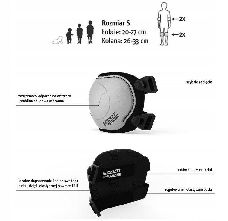 Скут та проїзд захисників на ліктях та колінах - чудове рішення для батьків, які хочуть забезпечити свою дитину максимальну безпеку під час їзди на скутері. Набір захисників колін та ліктя ефективно захищає делікатні суглоби малюка від травм, гарантуючи повну свободу руху та комфорту під час гри. Завдяки їх високоякісним матеріалам та функціональними рішеннями, захисники Scootandride є надійним вибором для активних дітей. Регульовані та гнучкі смуги дозволяють ідеально підходити до тіла дитини, а дихальний матеріал забезпечує комфорт навіть під час інтенсивного використання.