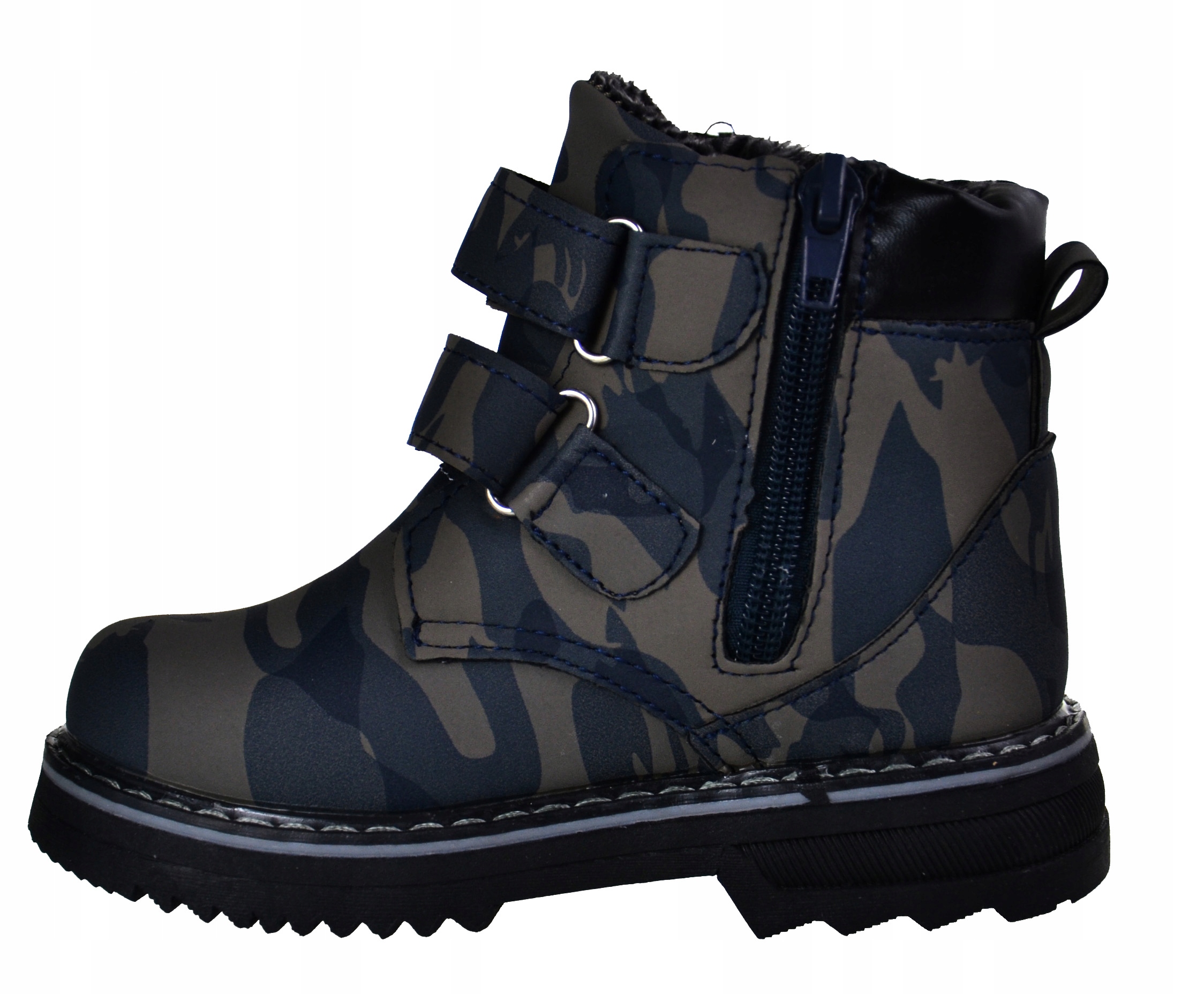 Зимові дитячі чобітки на плоскому ходу. Красиві камуфляжні ботильйони в 3 кольорах: чорний, зелений і синій. На інших аукціонах. Застібка-блискавка та додаткова липучка полегшують надягання. Взуття має протиковзку гумову підошву з протектором. Добре тримають стопу і підлаштовуються під будь-яку ногу. Взуття має утеплювач по всьому взуттю