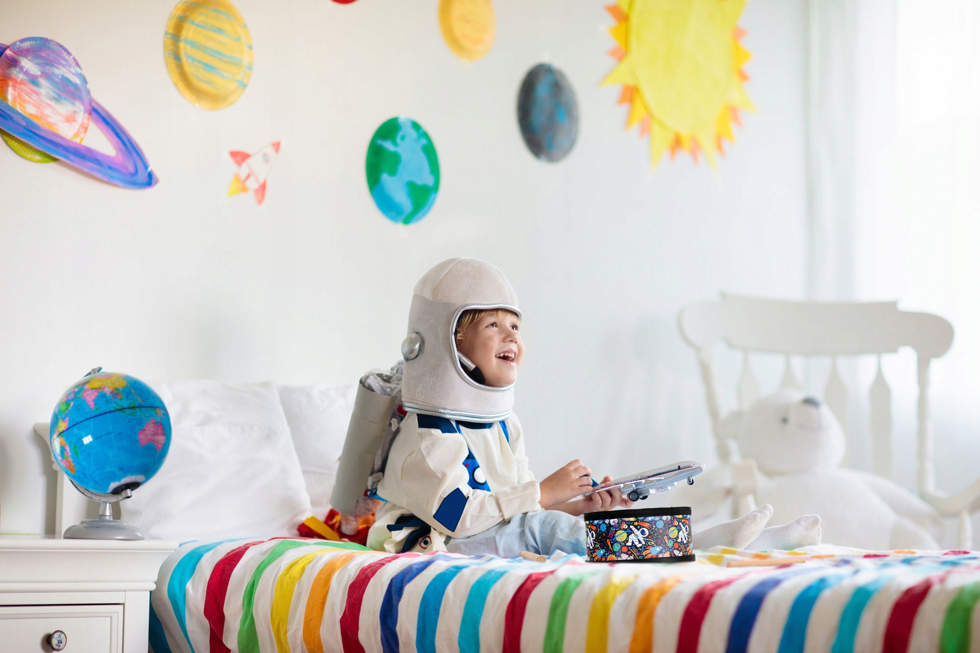 Дитячий барабан з космічним мотивом, діаметр 20,5 см, дерев'яний корпус, міцна пластикова мембрана, підходить для дітей від 3 років.
