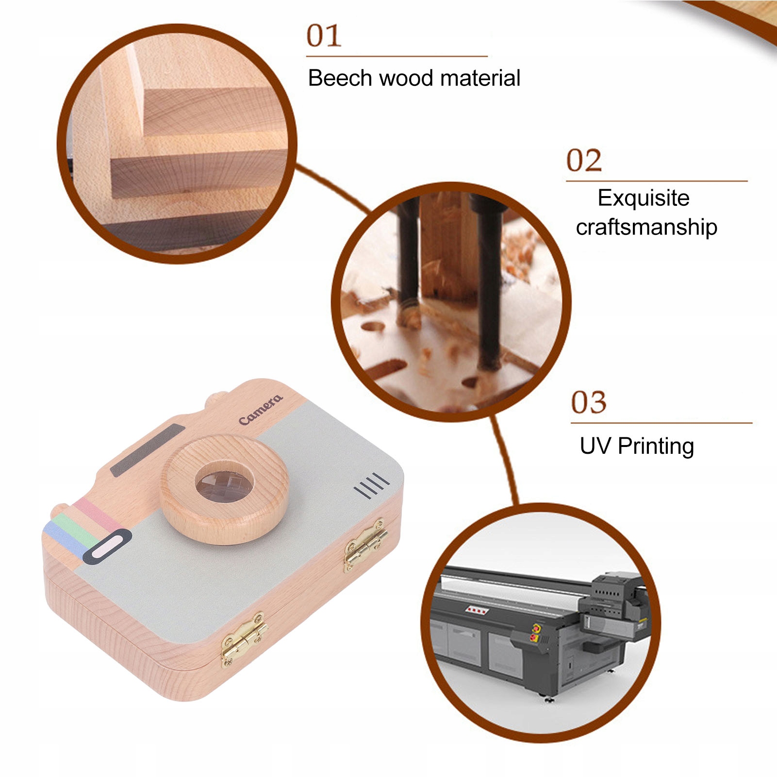 1. ДИЗАЙН У ФОРМІ КАМЕРИ: дерев’яна коробка для зберігання молочних зубів має привабливий дизайн камери, що пропонує унікальний і цікавий спосіб зберігання молочних зубів.
