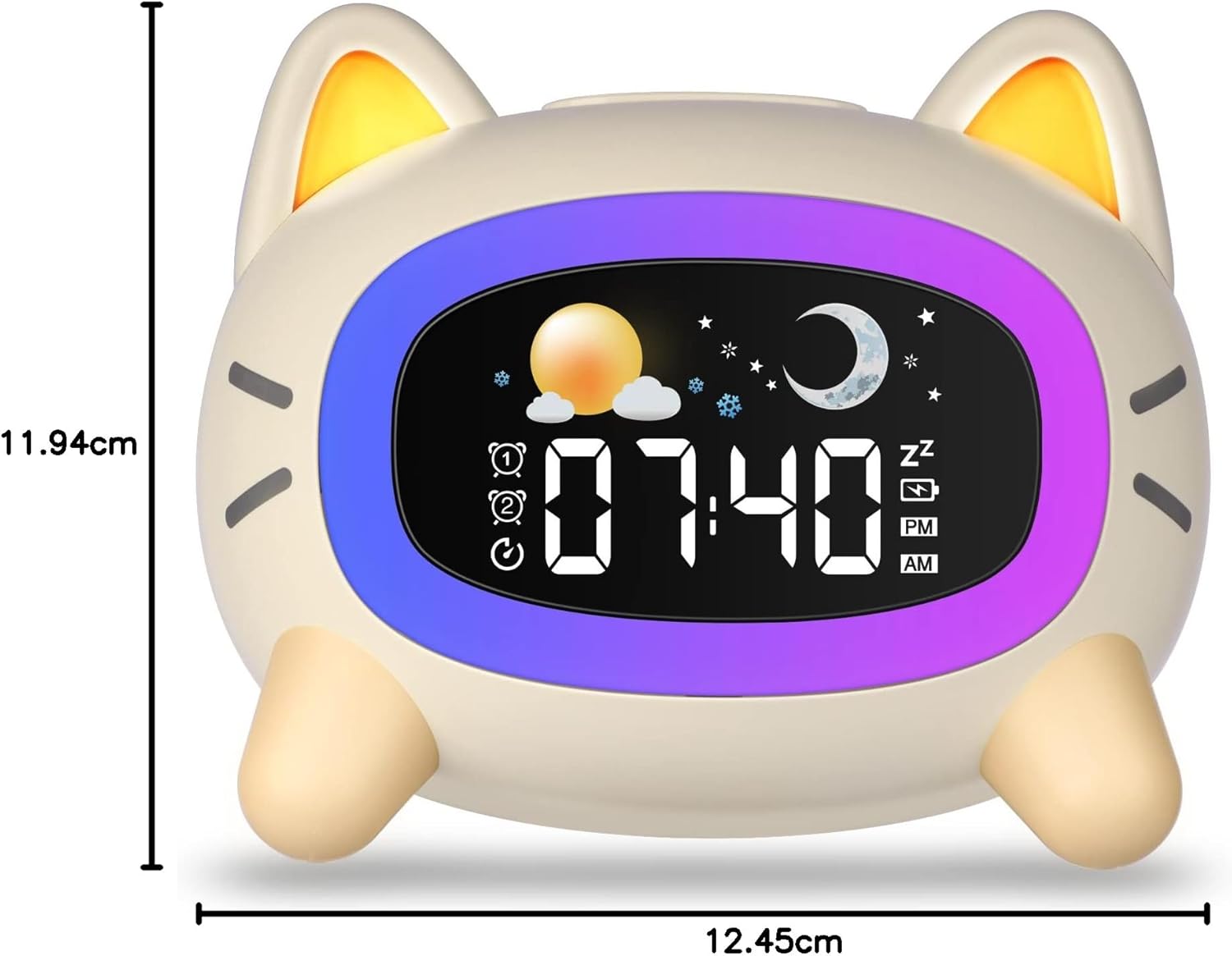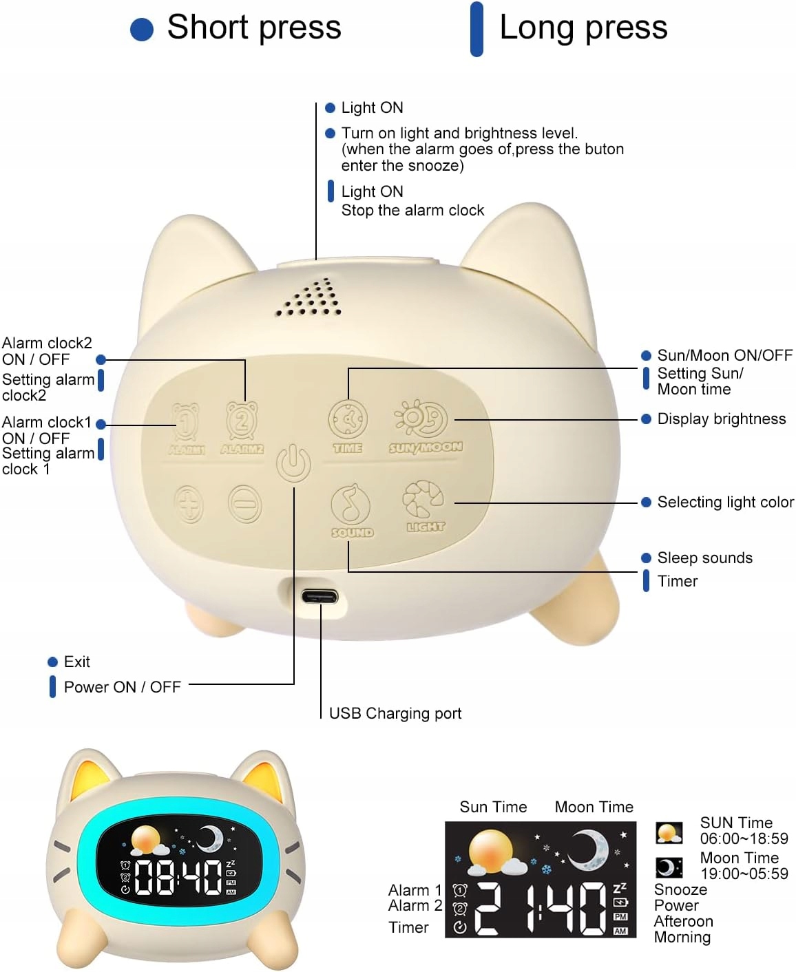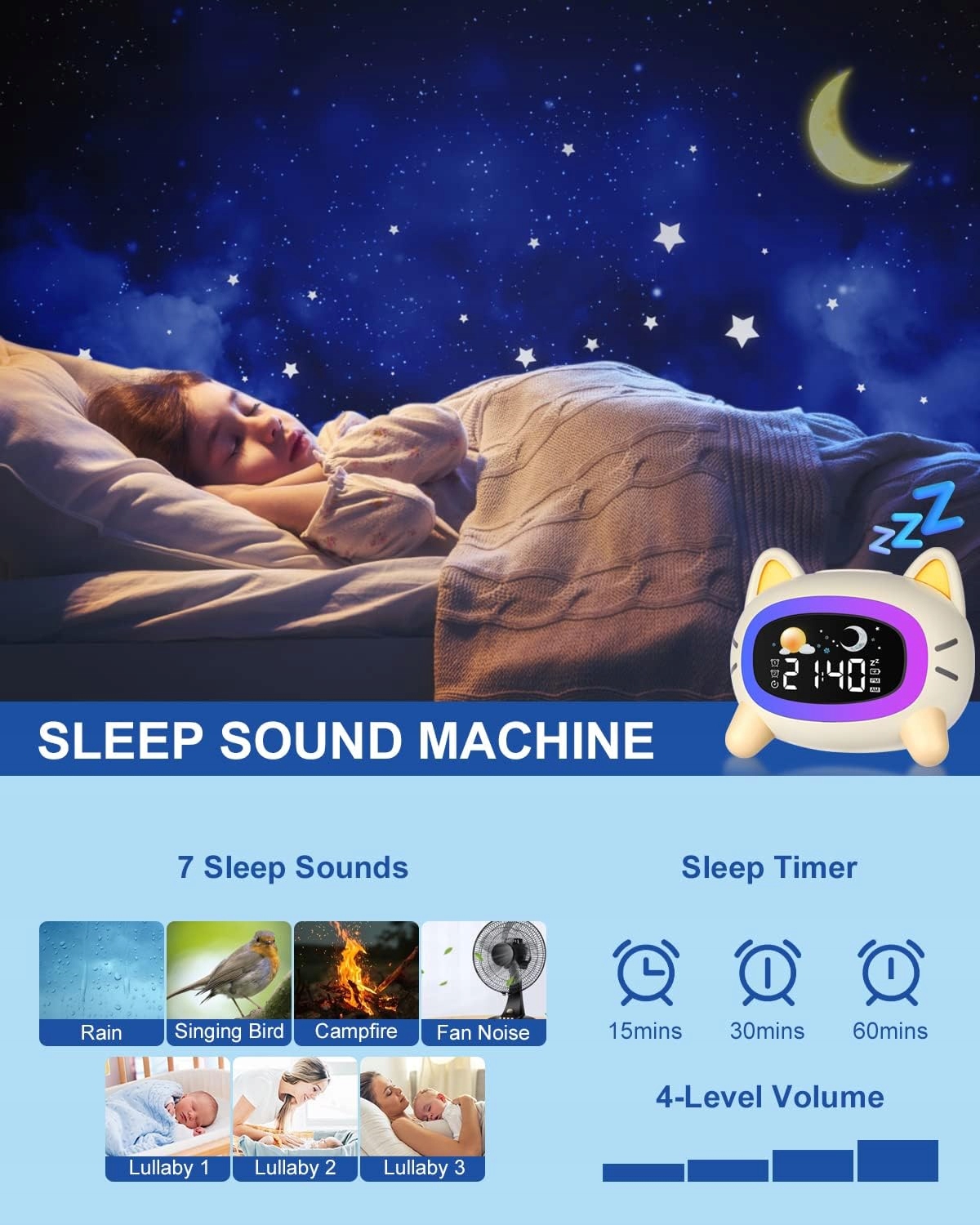 - Годинник тренувань сну: Наш будильник використовує піктограми та кольори, щоб допомогти дитині отримати гарну звичку до сну. Коли настає ранковий прокид, годинник з котом починає світити зеленим і спалахнути значок сонця, а це означає, що дитина повинна встати і розпочати хороший день. Коли настає час сну, синє світло та значок миготливого місяця нагадуватимуть вашій дитині, що настав час спати. Завдяки чарівному uplayteck, ваші діти можуть навчитися довше спати, щоб батьки могли довше спати. 4 Встановити час відтворення легко: 15, 30, 60 хвилин або безперервне відтворення.
