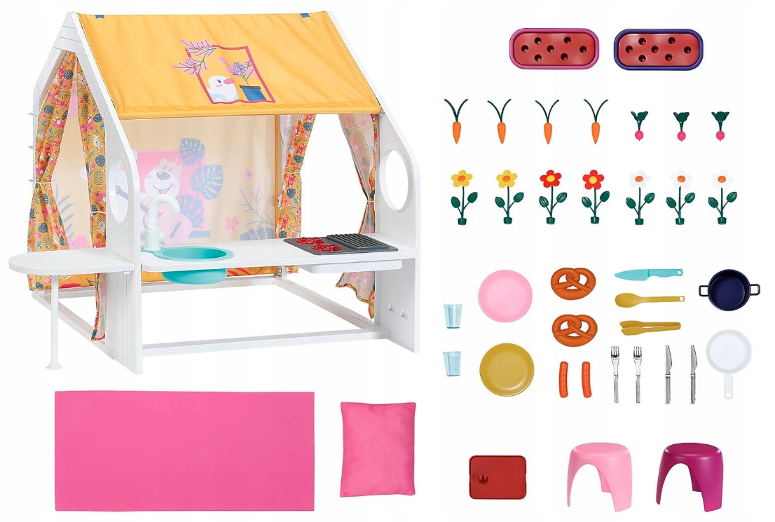 ✔ Багато аксесуарів включено до набору: Крім рожевого матраца та подушки, навколо кемпінгу є багато веселощів, включаючи 2 стільці, посуд, горщики, кренделі та ковбаси
