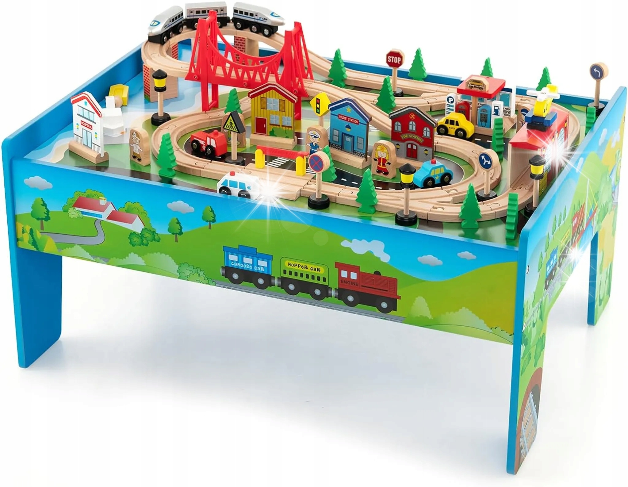 Дитячий потяг COSTWAY з 80 предметів, дерев'яний ігровий столик із перекидною та знімною стільницею, дерев'яний потяг для дітей від 3 років