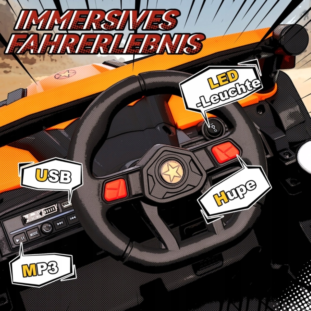 Захоплююча розвага: оснащений світлодіодними фарами, звуковим сигналом і музичними кнопками. USB-порт в електромобілі дозволяє відтворювати улюблені пісні чи історії, перетворюючи кожну поїздку на індивідуальну розвагу.