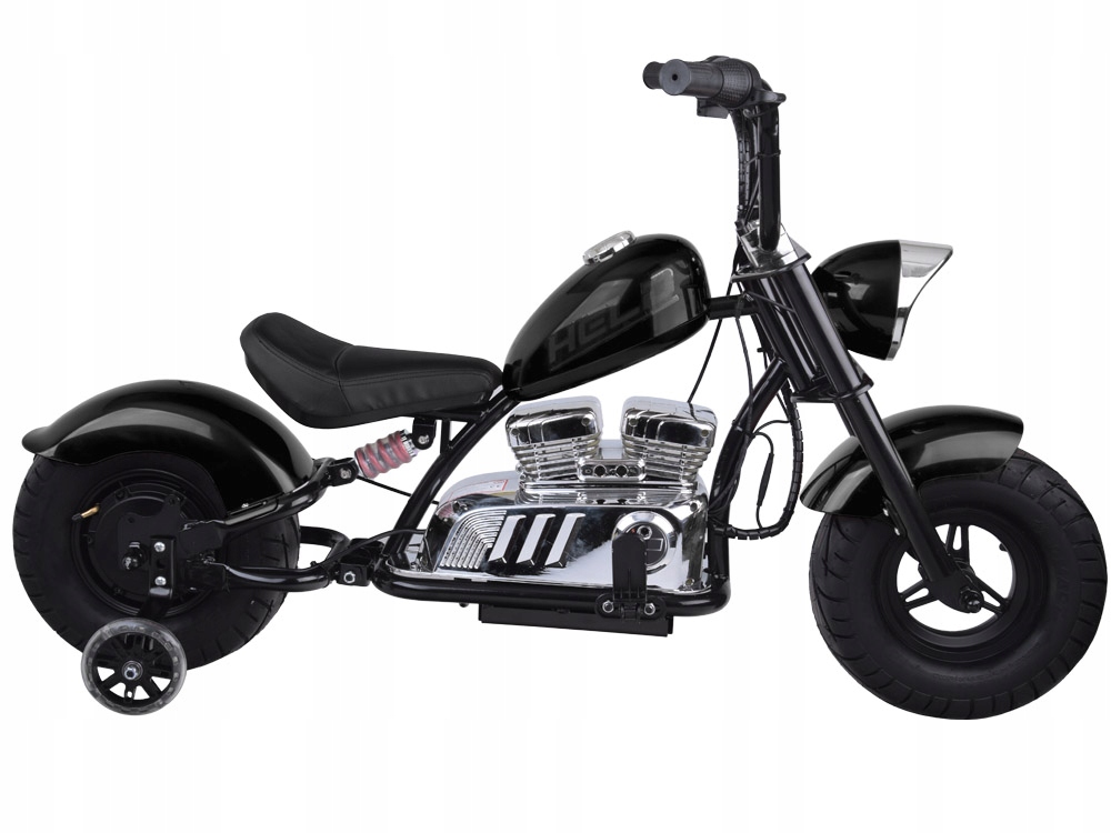 Швидкість регулюється в дросельній заслінці, тому дитина може почати кататися плавно і без ривків і налаштувати їзду відповідно до своїх навичок. Дискове гальмо гарантує безпеку під час руху. Чоппер оснащений зручними підніжками, що підвищує комфорт водіння. Додатково в комплект входять бічні колеса, що неодмінно стане в нагоді при навчанні їзді на велосипеді. Згодом, коли дитина почуватиметься на мотоциклі впевнено, його можна відкрутити. Тоді стане в нагоді підставка, завдяки якій можна безпечно відкласти двигун на стоянці.