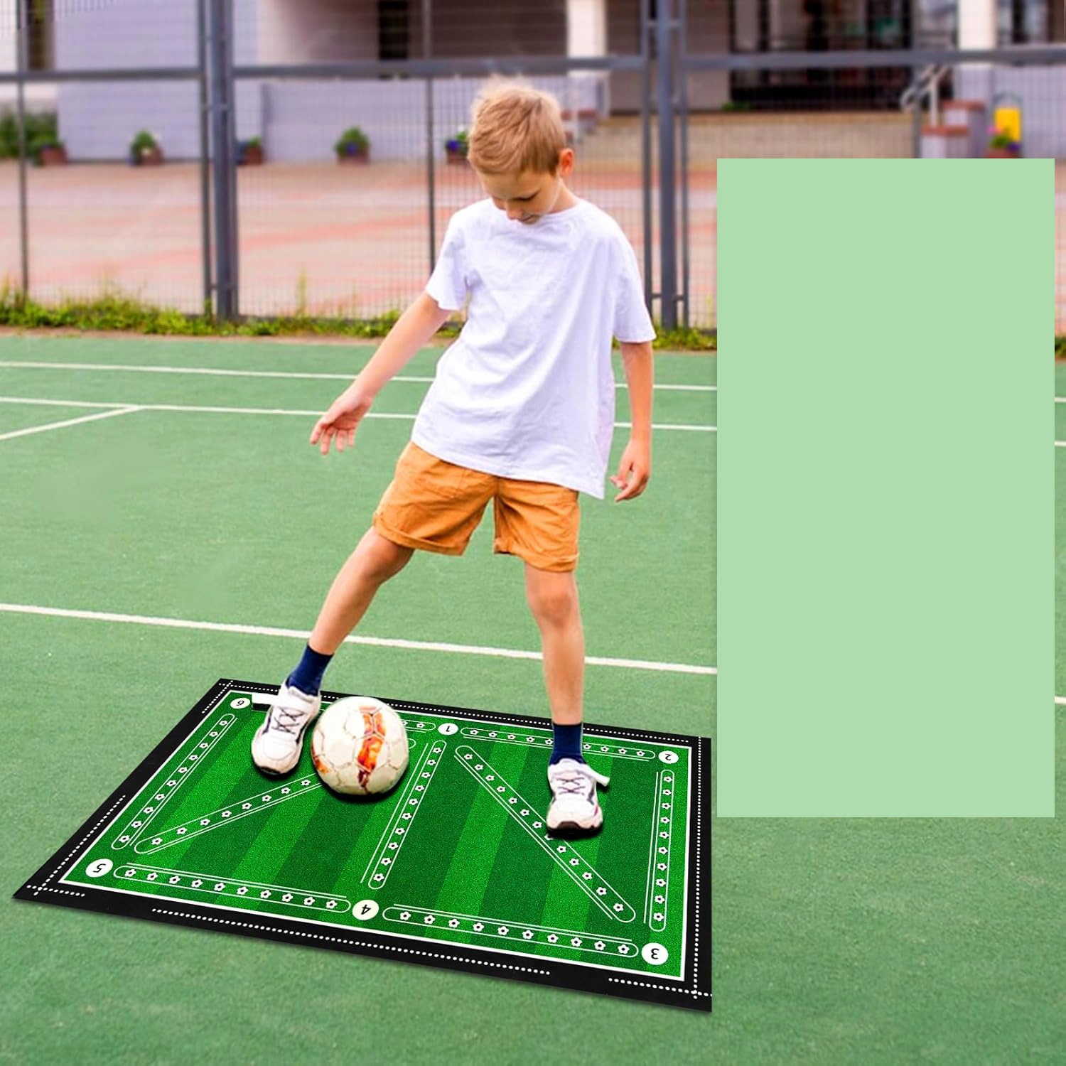 🏃♂️ Покращуйте свою футбольну гру за допомогою нашого тренувального килимка. Добре виконуйте вправи з кроком назад, чергуючи рухи внутрішньої та зовнішньої сторони стопи, 💪 бічні поштовхи та швидку зміну напрямку, щоб покращити свою спритність і покращити навички на корті.