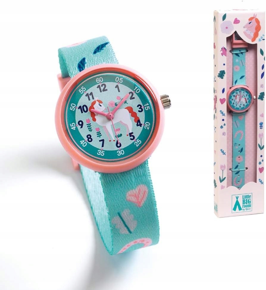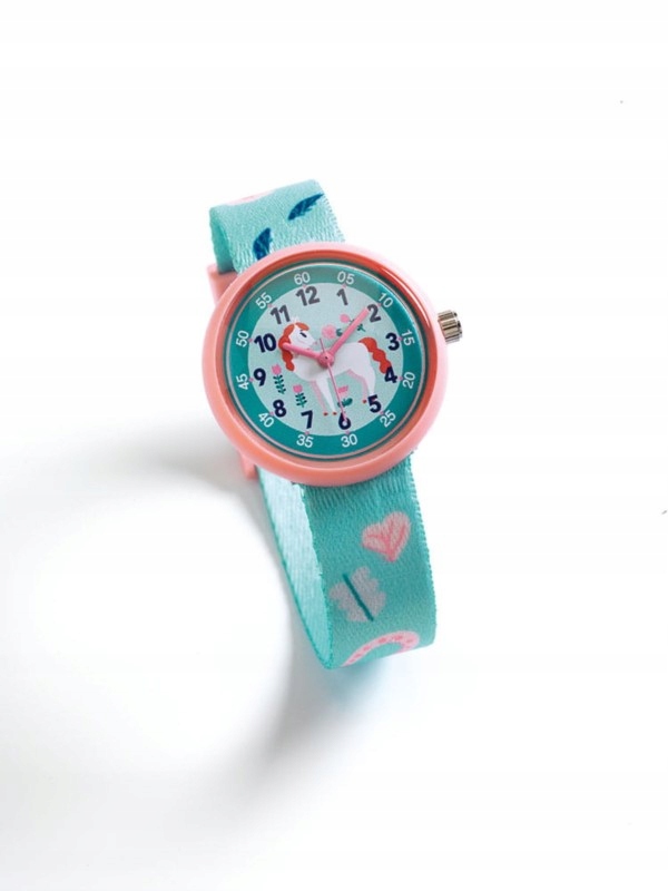 Пастельне дитячий годинник з єдинорогом Djeco на м'якому ремінці. Годинник з рожевим монетним конем порадує дівчину, він буде корисним для навчальних годин, вимірюючи час, це прекрасні прикраси. Браслет годинник виготовлений з приємного матеріалу для шкіри, кліп з регульованою пряжкою. Дитячі поради з другим