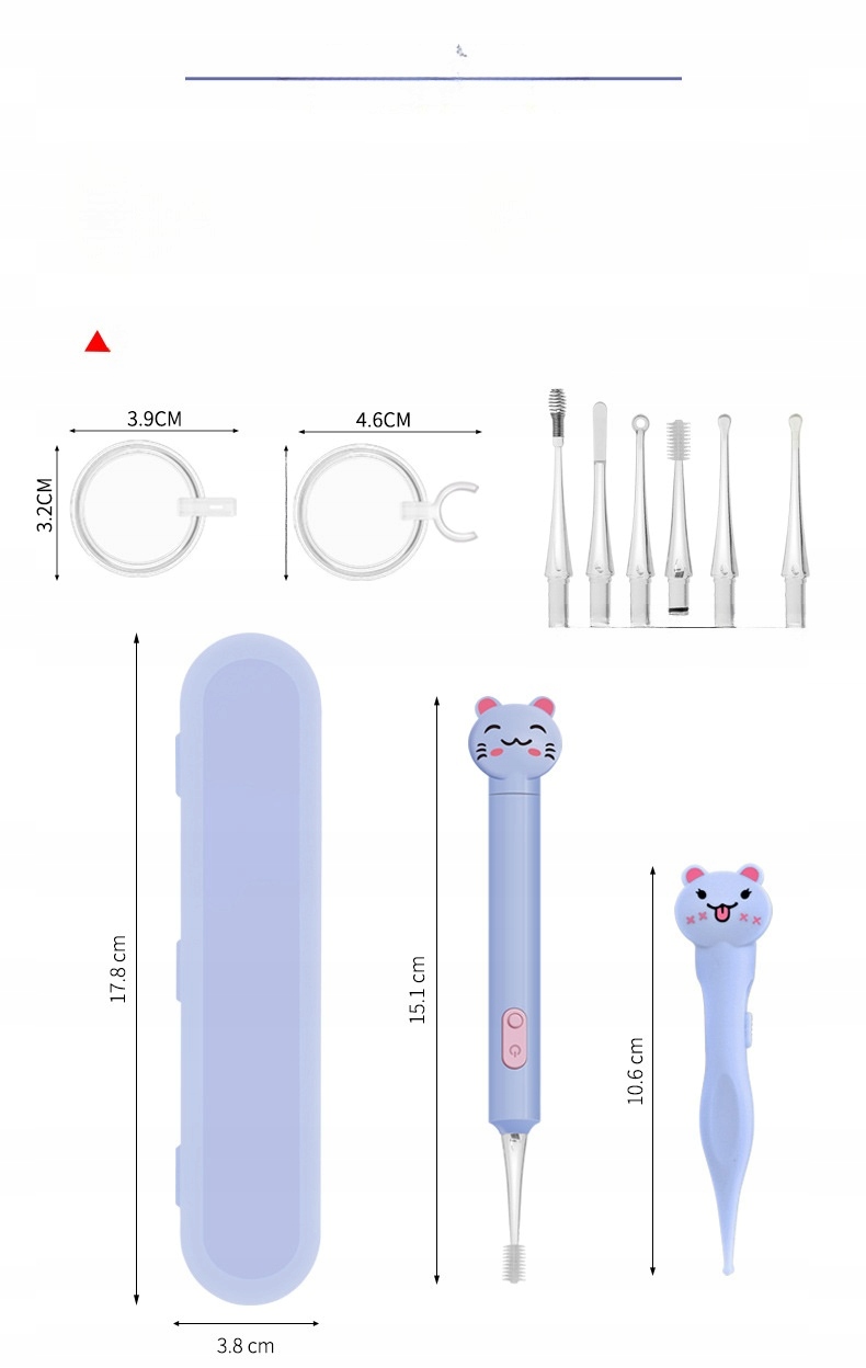 ✅ 1 вушна ложка 6 змінних наконечників 1 коробка для зберігання 1 лупа 1 затиск для вушної сірки 3 кнопкові батарейки