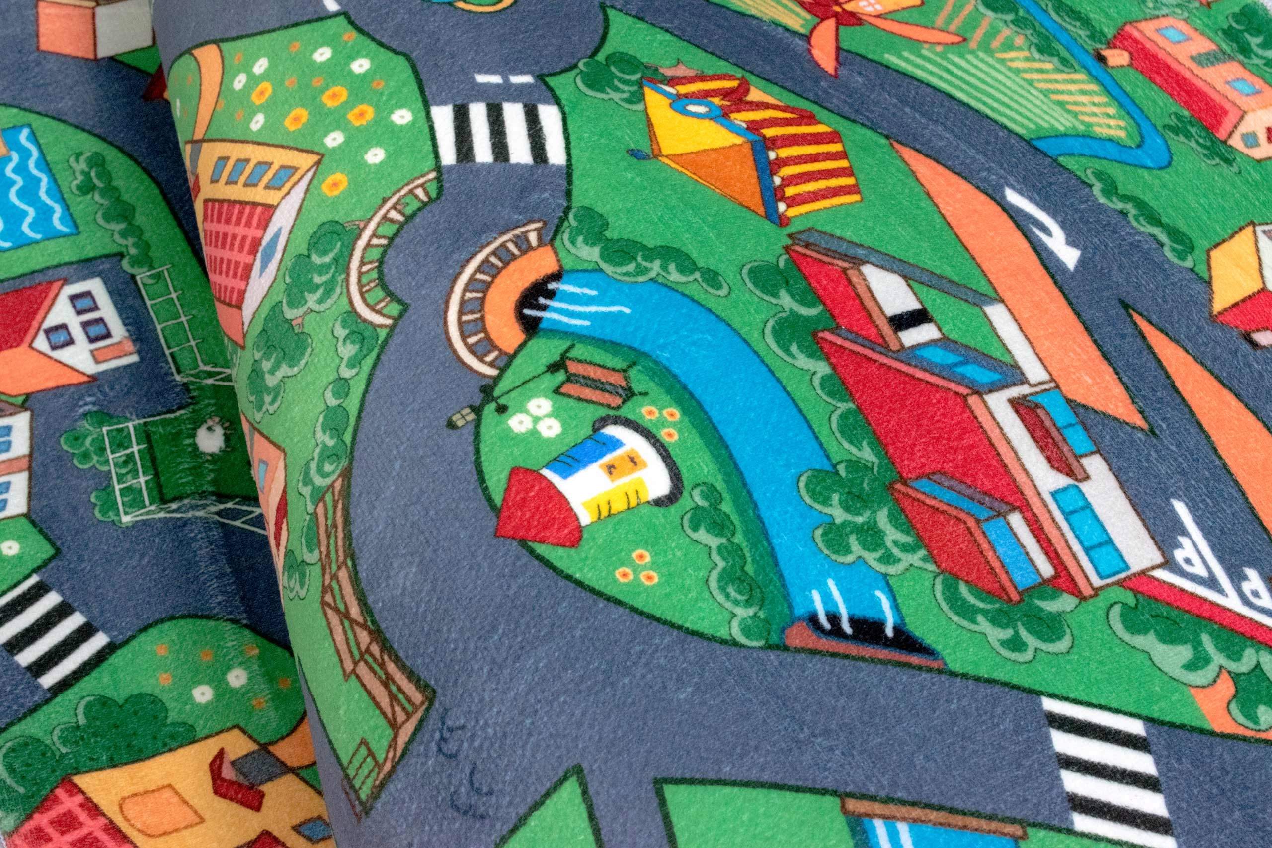Вуличний візерунок: барвистий і деталізований візерунок міста з дорогами робить цей килим ідеальним місцем для організації ігор з автомобілями, потягами чи іграшками, пов’язаними з дорожнім рухом.