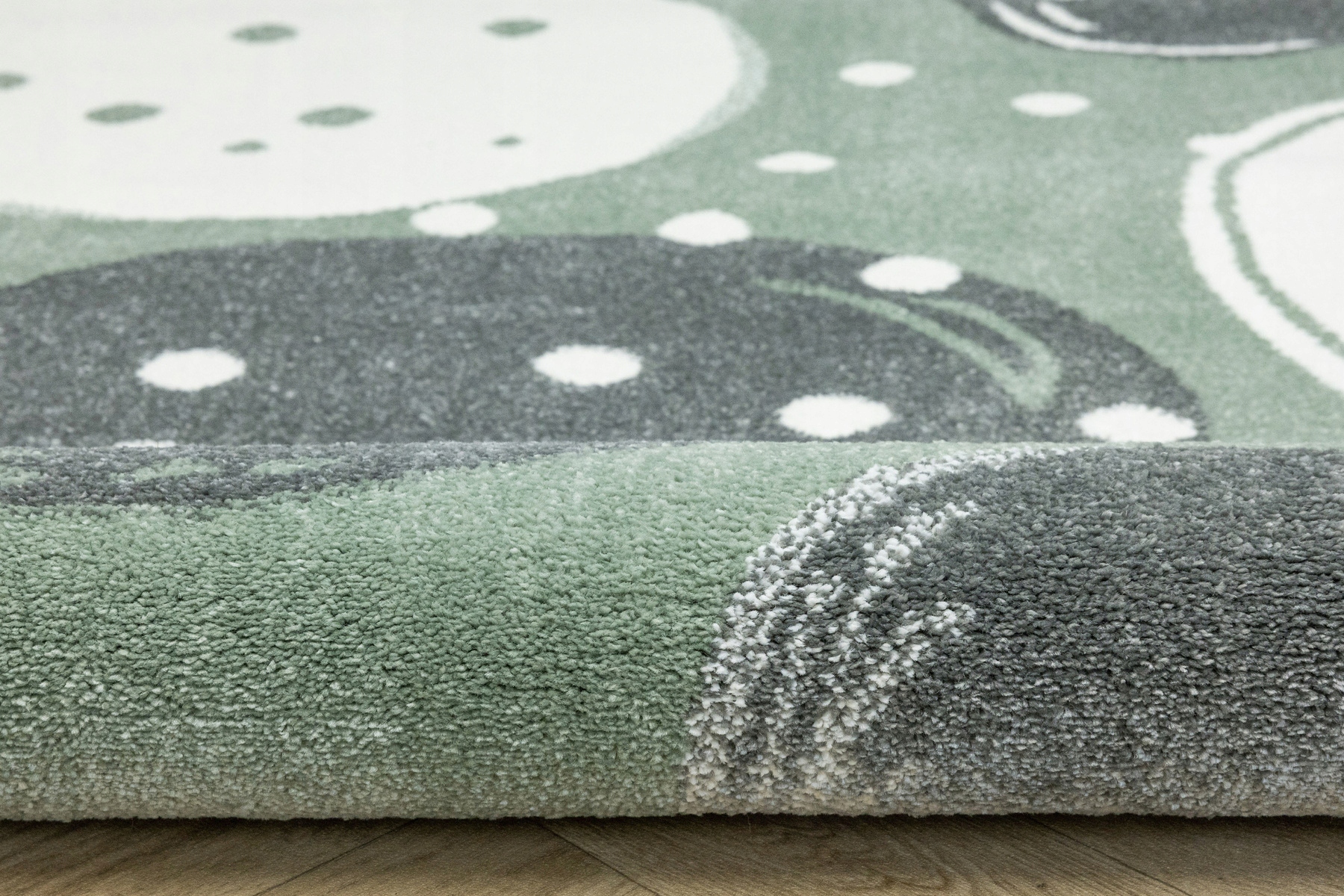 Килим Lima вирізняється сучасним, дитячим візерунком у вигляді великих неправильних кіл з точковим мотивом, які створюють веселу та динамічну композицію. Фон м'ятного, пастельного зеленого ідеально гармонує з контрастними елементами кремового, графітово-сірого та блакитного кольорів. Виглядає все це гармонійно і енергійно - воно чудово оживляє простір дитячої кімнати, вносячи веселу, доброзичливу атмосферу.