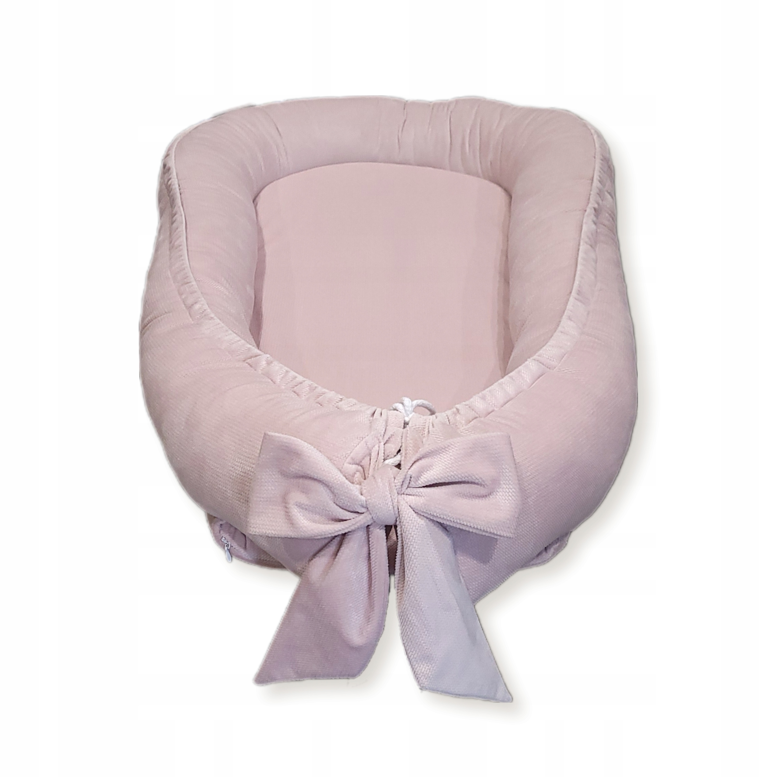 Я представляю свою пропозицію щодо кокона з бантом брудно-рожевого кольору, зовнішні розміри приблизно 90 см x 55 см, а спальна зона приблизно 70 см x 30 см.