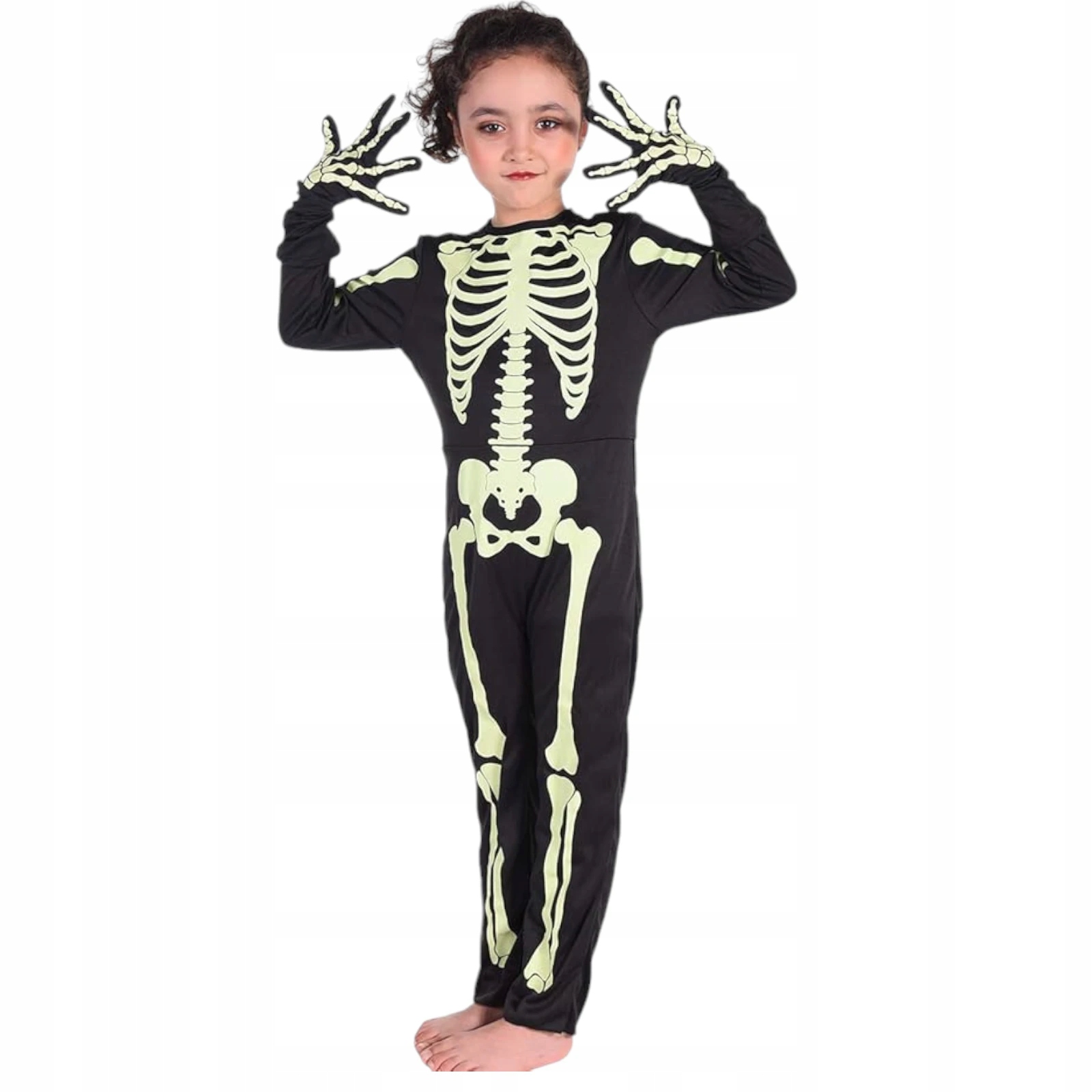 - У комплект входять: комбінезон, шапка та теплі трикотажні рукавички з принтом флуоресцентних кісточок. Все в одному, щоб повністю відтворити фігуру скелета.