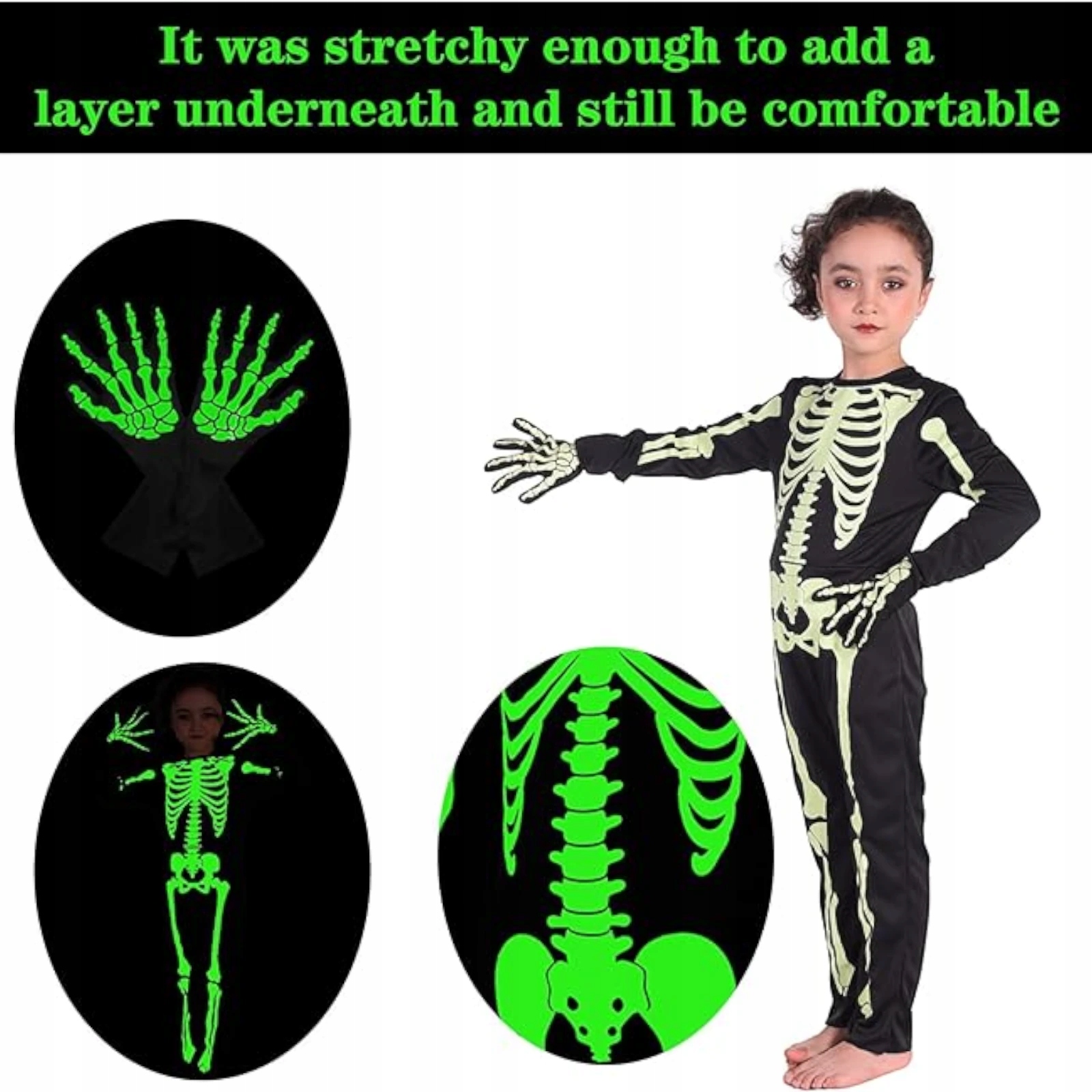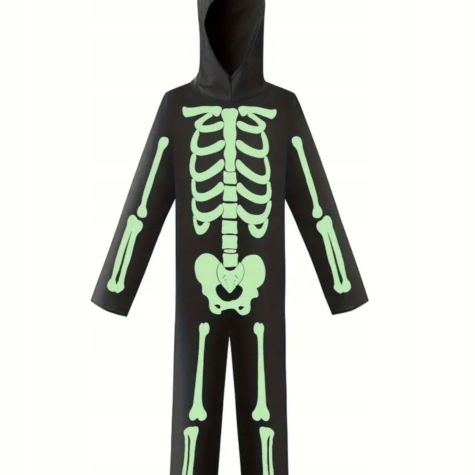 - Флуоресцентний ефект: костюм із малюнком скелета, який світиться в темряві, створює дивовижний візуальний ефект. Чудова розвага та додатковий вау-ефект, особливо на вечірках після настання темряви!