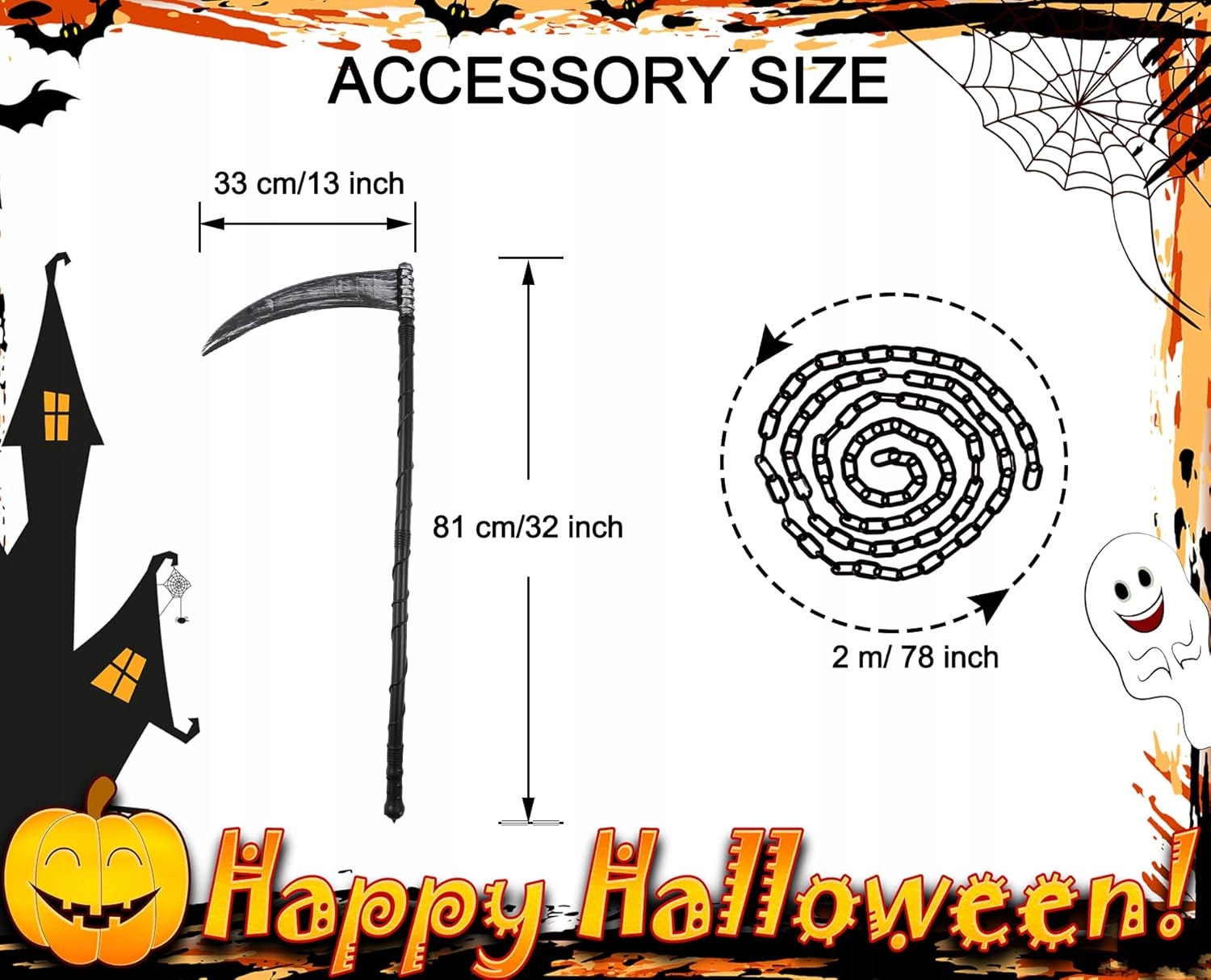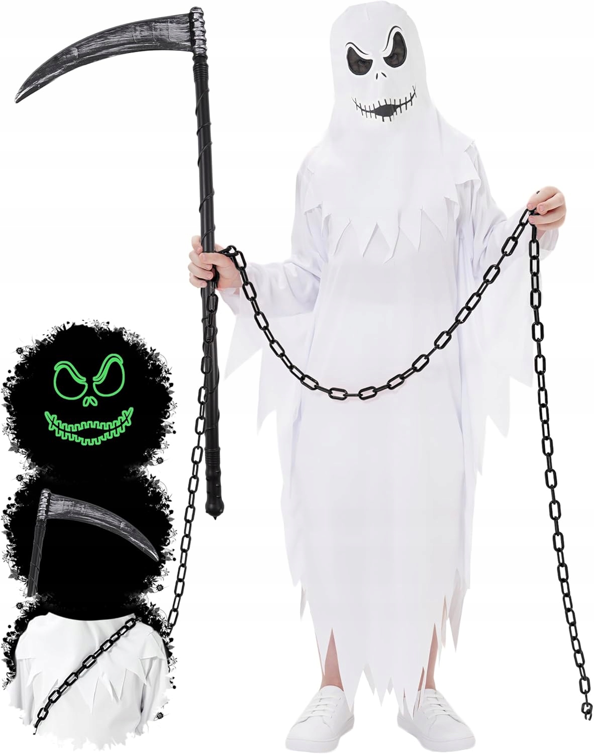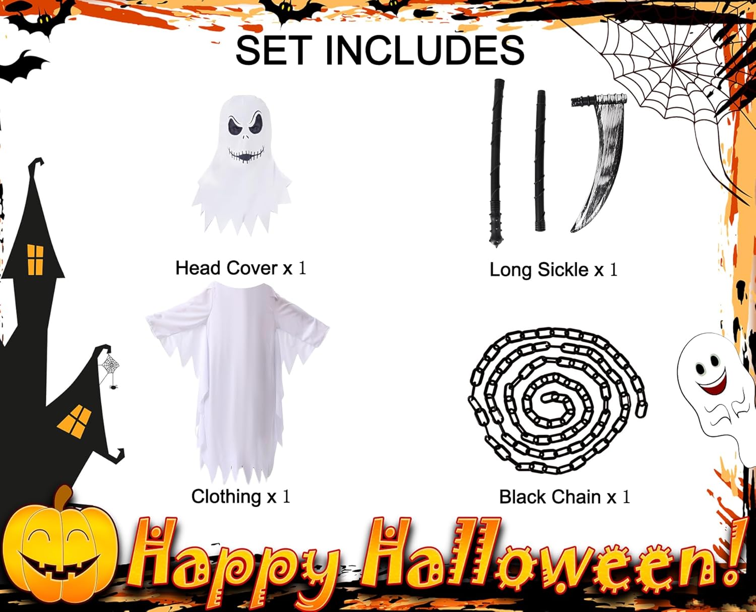 - Набір мантії привида: 1 біла мантія привида, 1 сітчастий капюшон, 1 серп на Хелловін, 1 пластиковий ланцюжок.