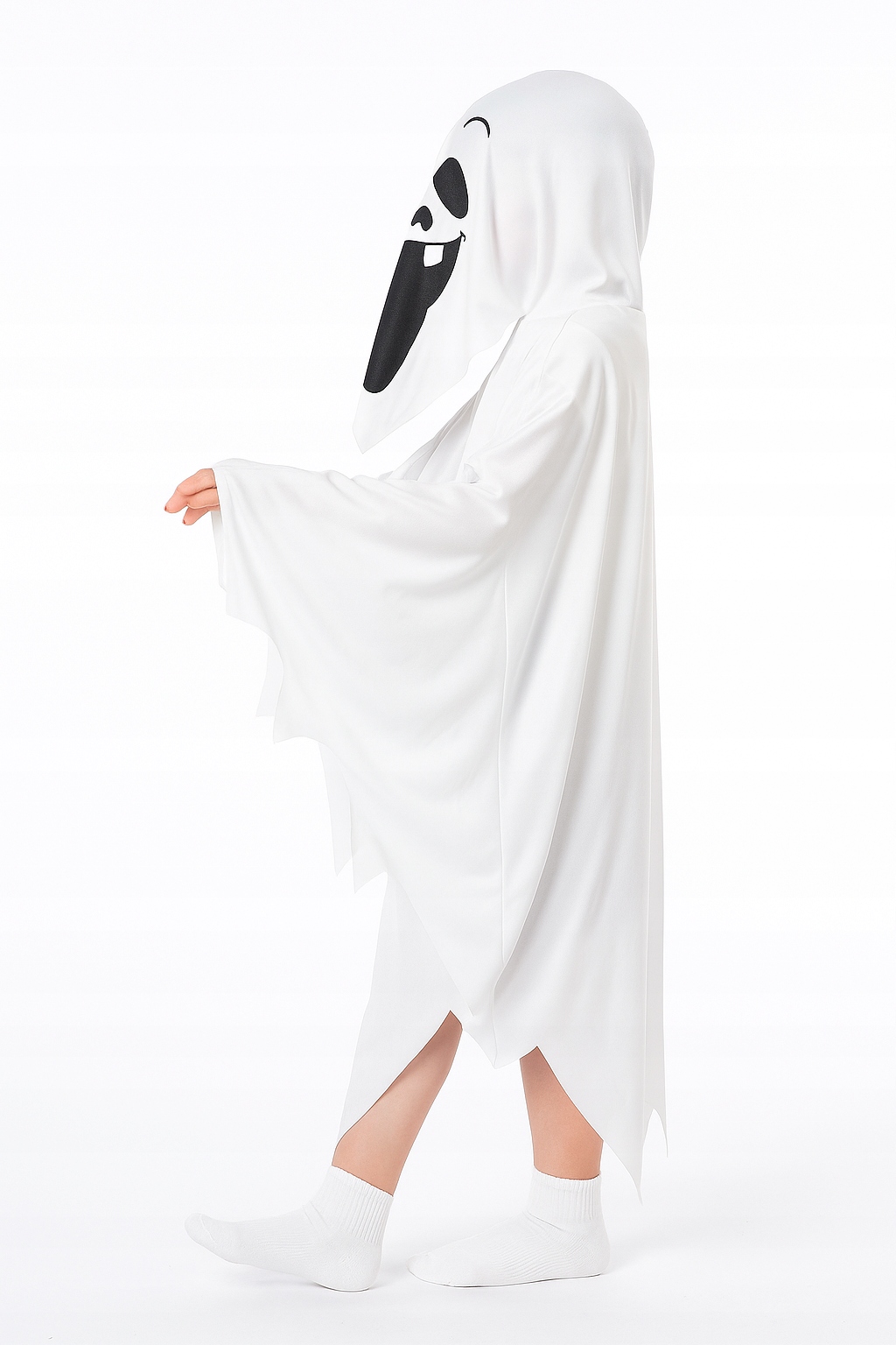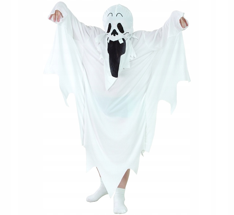 Костюм привида виготовлений з легкого, повітряного матеріалу, який красиво драпірується і «хвилюється» при кожному русі. Маска з усміхненим обличчям надає всьому цьому забавний характер - ідеально підходить для дітей, які віддають перевагу страшним, але гарним костюмам. Капюшон і великі рукави дозволяють створити ефект ширяння в повітрі - як справжній привид з казки!