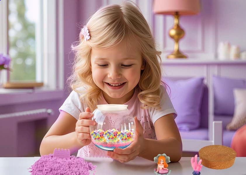 Розкрийте творчі здібності вашої дитини з нашим унікальним набором русалок, який містить чарівний пісок, зелену водяну траву з хімічною завивкою, 13-кольоровий світлодіодний нічник з дистанційним керуванням і колекцію іграшок на тему русалок.