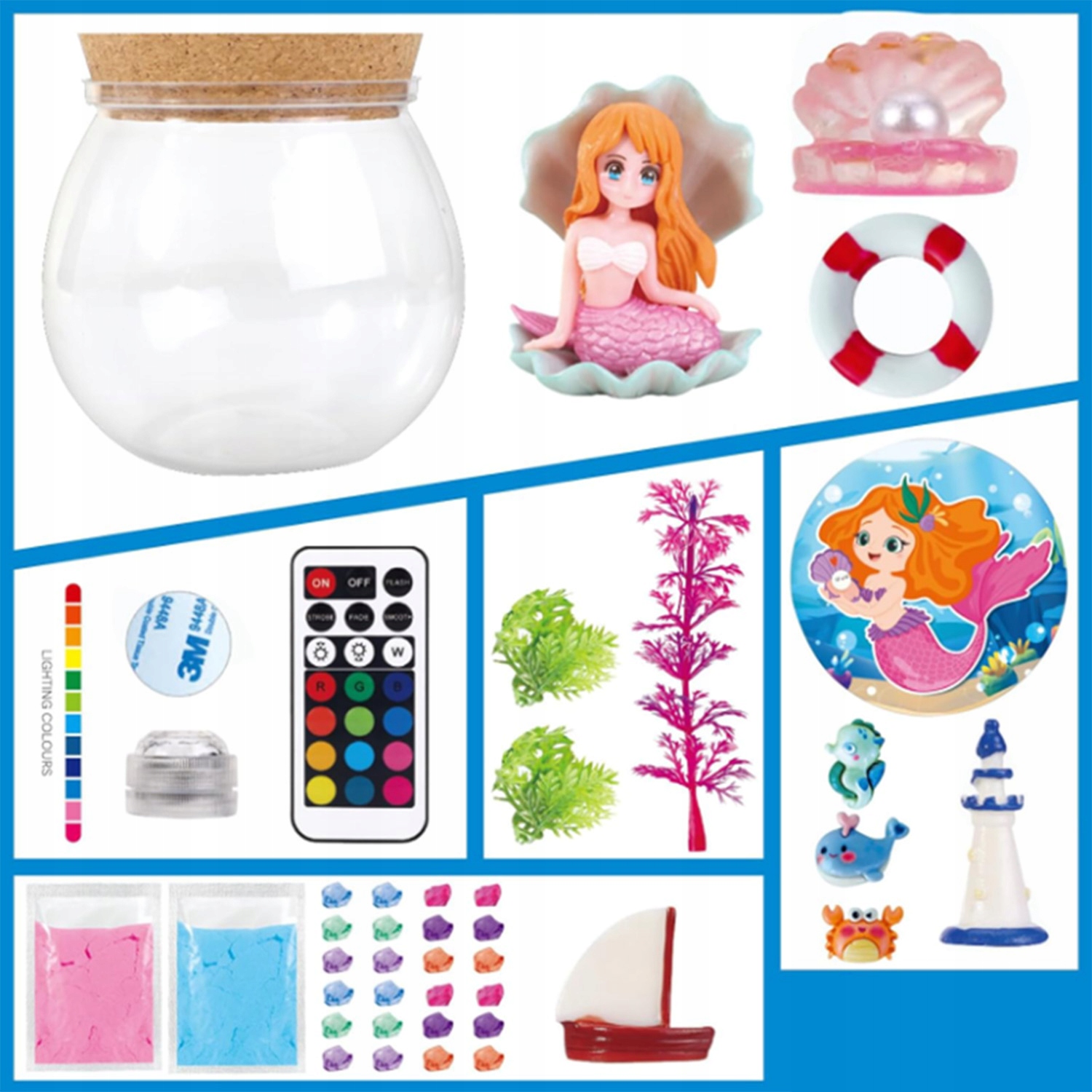 ✨- У набір входить космічний пісок, мох, пульт дистанційного керування, Світлодіодна лампа, лялька-русалка та багато іншого.