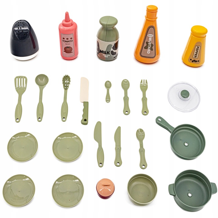На кухні також є вбудована мийка з краном , полицями, підвісками для кухонних аксесуарів та аксесуарів. Після гри все слід вимивати, витерти і вводити на місце - це ідеальний спосіб навчити дитину продовжувати порядок на місці гри.