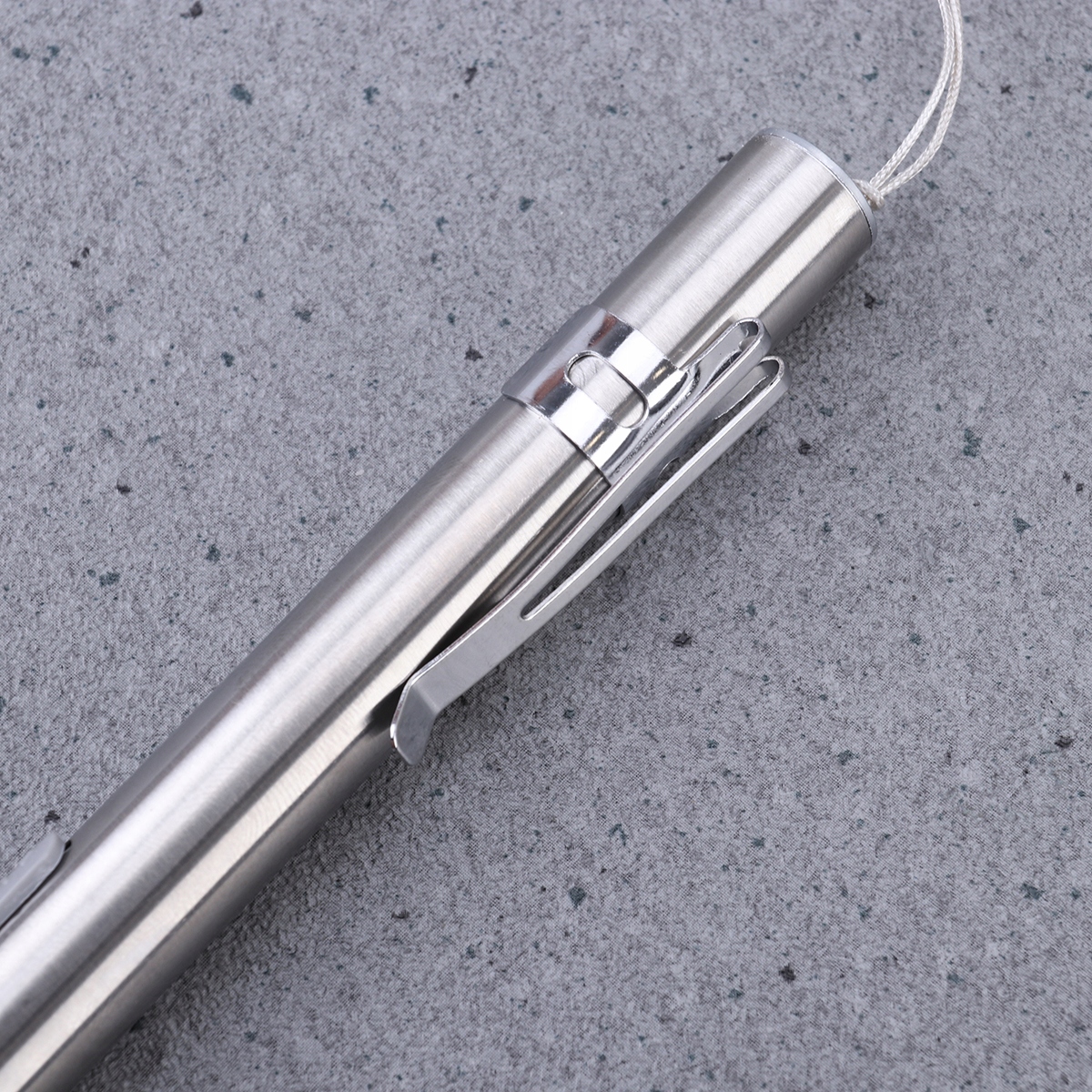 Корпус із нержавіючої сталі; Цей ліхтарик у формі ручки довговічний, твердий і міцний. Він має форму ручки із затискачем, який можна закріпити на штанях, кишенях, рюкзаках та інших місцях, тобто його легко носити з собою. Він працює від батареї, тому не потребує частої заміни батареї.