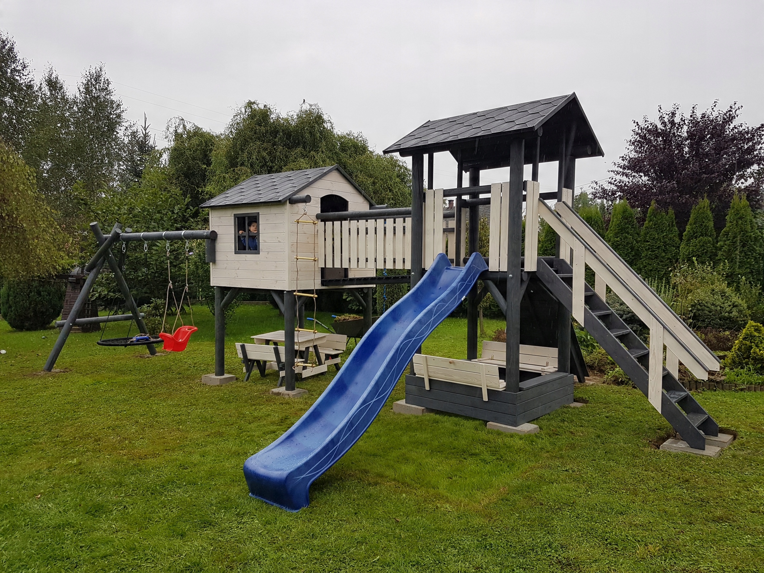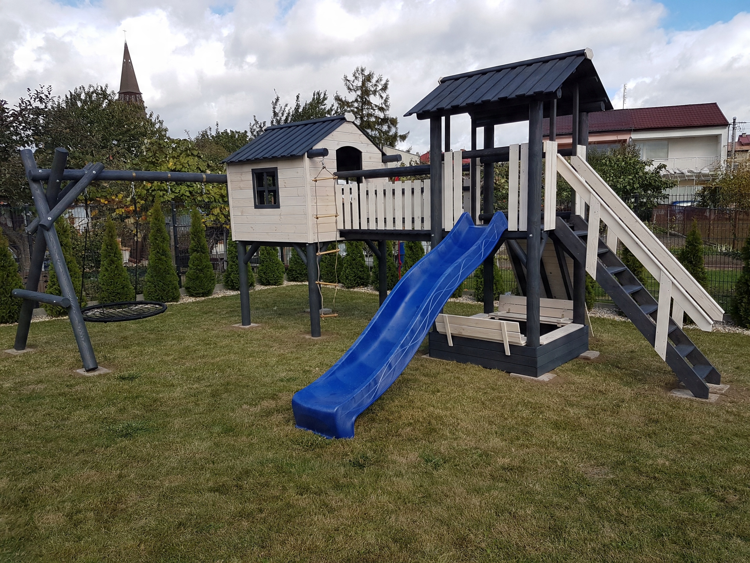 Це не якісний продукт дешевих супермаркетів. Кожен виріб виготовлено з великою увагою до деталей, що забезпечує естетику, безпеку та довговічність. Стіни будинку виготовлені з шпунтованої дошки, решта дошки фрезеровані напівкругло. Все це прикручується столярними шурупами. Конструкція легко витримує навантаження дорослої людини, тому ви можете слідкувати за дитиною всередині. Якщо ви виберете варіант фарбування, ми гарантуємо, що кожен, навіть найменший, елемент буде пофарбований окремо. Це гарантує захист не лише там, де це видно, але й там, де немає доступу, шляхом традиційного фарбування після загвинчування.