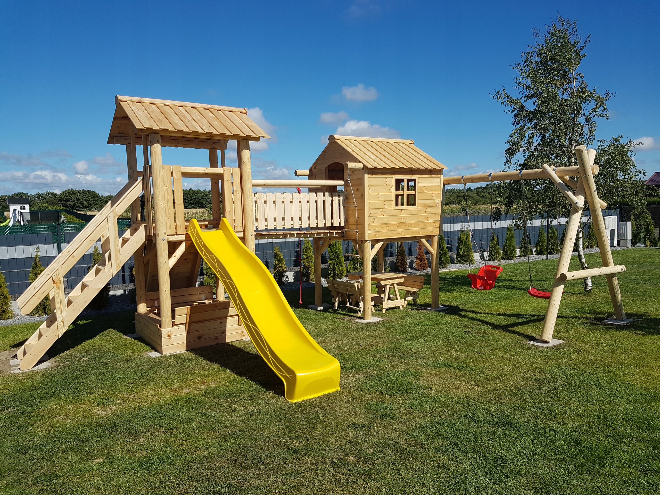 Це не якісний продукт дешевих супермаркетів. Кожен виріб виготовлено з великою увагою до деталей, що забезпечує естетику, безпеку та довговічність. Стіни будинку зроблені з шпунтованої дошки, решта дошки фрезеровані напівкругло. Все це прикручується столярними шурупами. Конструкція легко витримує навантаження дорослої людини, тому ви можете піти за дитиною всередину. Якщо ви виберете варіант фарбування, ми гарантуємо, що кожен, навіть найменший, елемент буде пофарбований окремо. Це гарантує захист не лише там, де це видно, але й там, де немає доступу, шляхом традиційного фарбування після загвинчування.