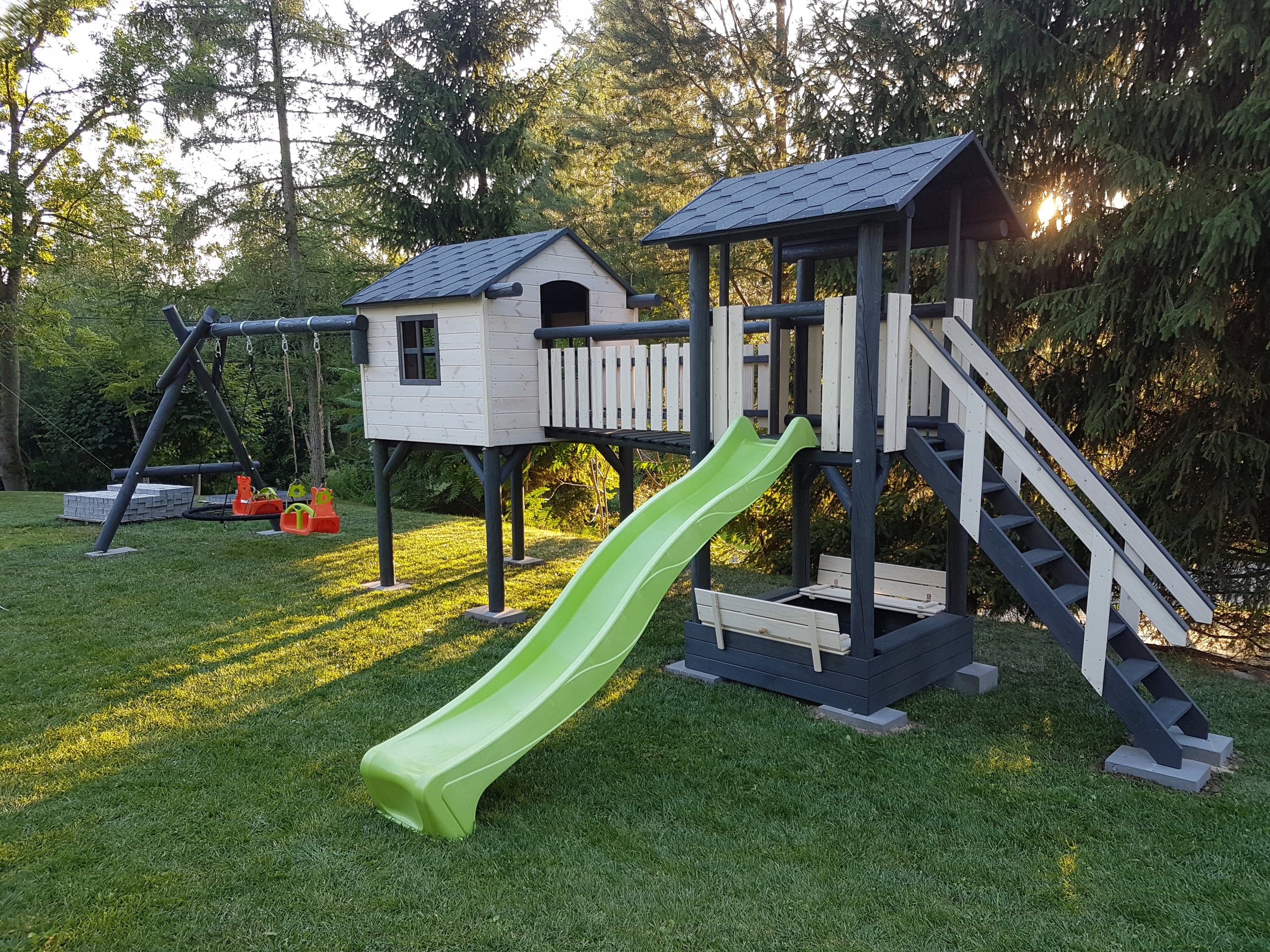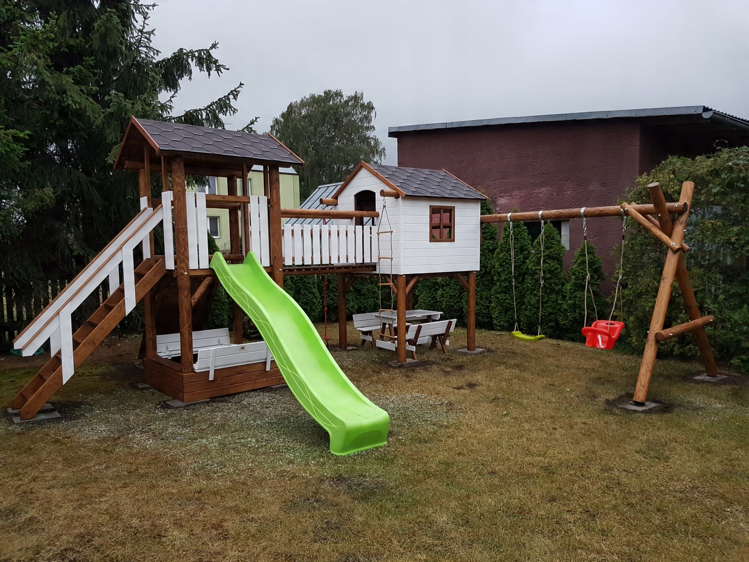 Це не якісний продукт дешевих супермаркетів. Кожен виріб виготовлено з великою увагою до деталей, що забезпечує естетику, безпеку та довговічність. Стіни будинку зроблені з шпунтованої дошки, решта дошки фрезеровані напівкругло. Все це прикручується столярними шурупами. Конструкція легко витримує навантаження дорослої людини, тому ви можете піти за дитиною всередину. Якщо ви виберете варіант фарбування, ми гарантуємо, що кожен, навіть найменший, елемент буде пофарбований окремо. Це гарантує захист не лише там, де це видно, але й там, де немає доступу, шляхом традиційного фарбування після загвинчування.