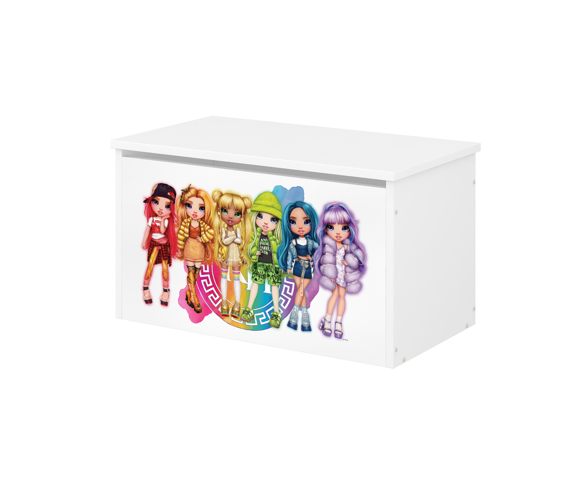 Контейнер для іграшок — це практичний і функціональний предмет меблів, який знайде своє місце в кожній дитячій кімнаті. Ергономічні розміри забезпечують вільне облаштування приміщення. Ящик виготовлений з білого ДСП, оброблений шпоном. Передня частина контейнера має барвистий принт, який має приємні яскраві кольори та захищений спеціальним ламінатом, щоб запобігти вицвітанню або стиранню. Ви можете сміливо мити його тканиною та рідиною. Наші контейнери мають сповільнювач, який запобігає різкому закриванню кришки, захищаючи мізинці ваших дітей!