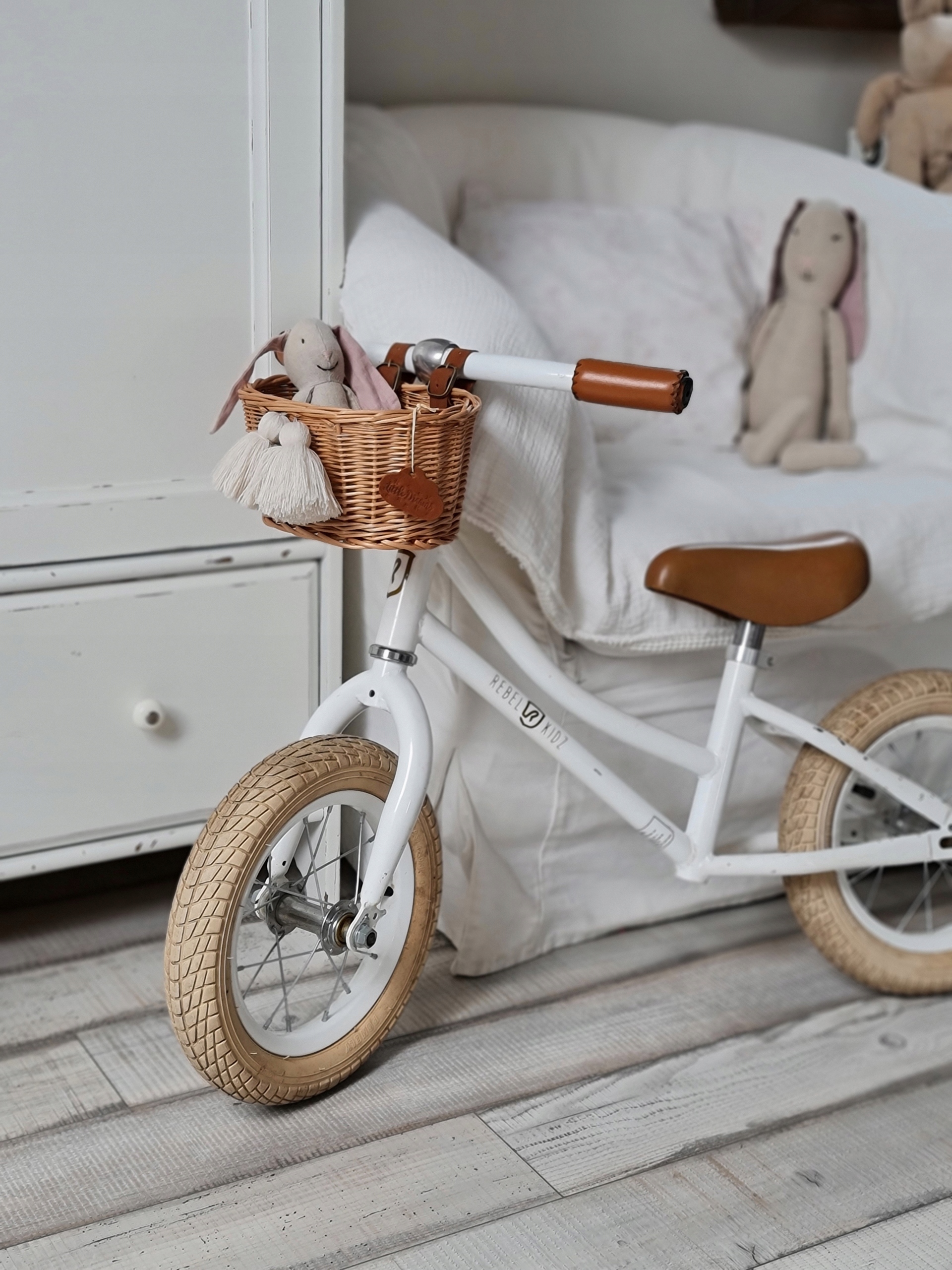 Красивий плетений велосипедний кошик із застібками з натуральної шкіри. Для найнеобхідніших скарбів маленького мандрівника.
