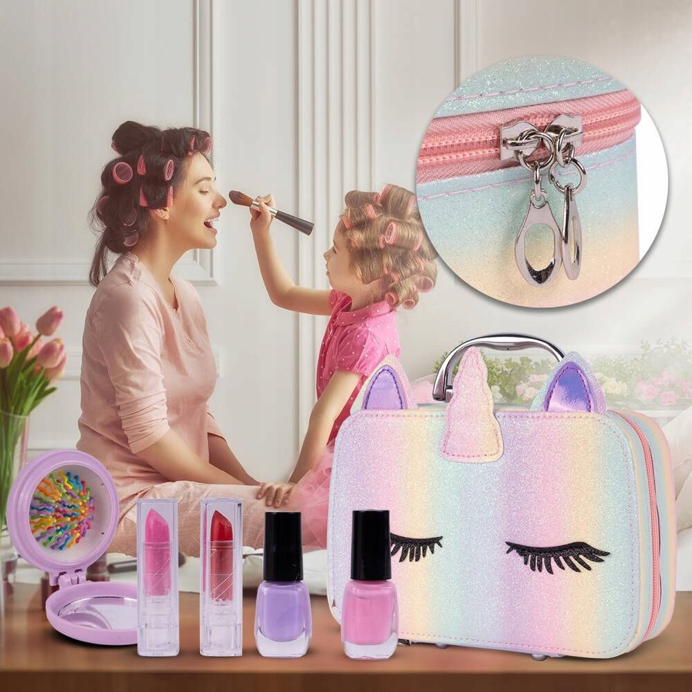 Усі речі упаковані в чарівну косметичку у формі єдинорога із застібкою-блискавкою, тож ви можете брати її з собою, куди завгодно, і ваша косметика буде на своєму місці та не загубиться під час носіння.