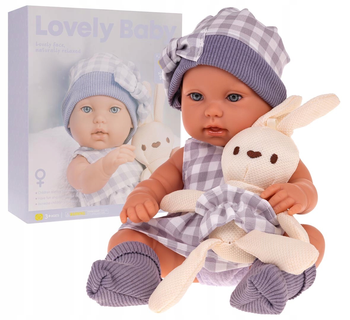 лялька, встановлена з аксесуарами для дитини від 3 років. Набір включає прекрасну дитину в сукні з зайчиком приємним і кошиком для трансферу, щоб ваша дитина могла взяти його скрізь із собою. Лялька лялька ідеально закінчена, увага до кожної деталі та повністю безпечна для дитини. У нього знімне плаття, капелюх, труси та шкарпетки. Рухні ноги та ручки полегшують вас. Іграшка стимулює руховий розвиток дитини. Функції іграшки: