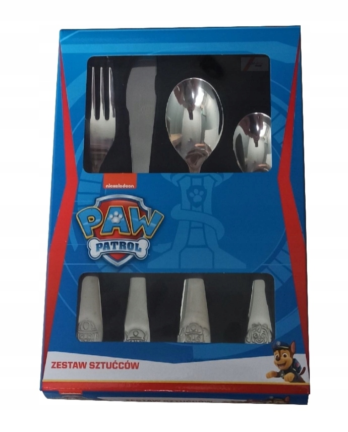 - Набір столових приборів для дітей з високоякісної нержавіючої сталі, профільований під дитячу руку, з мотивом героїв мультфільму «Щенячий патруль».