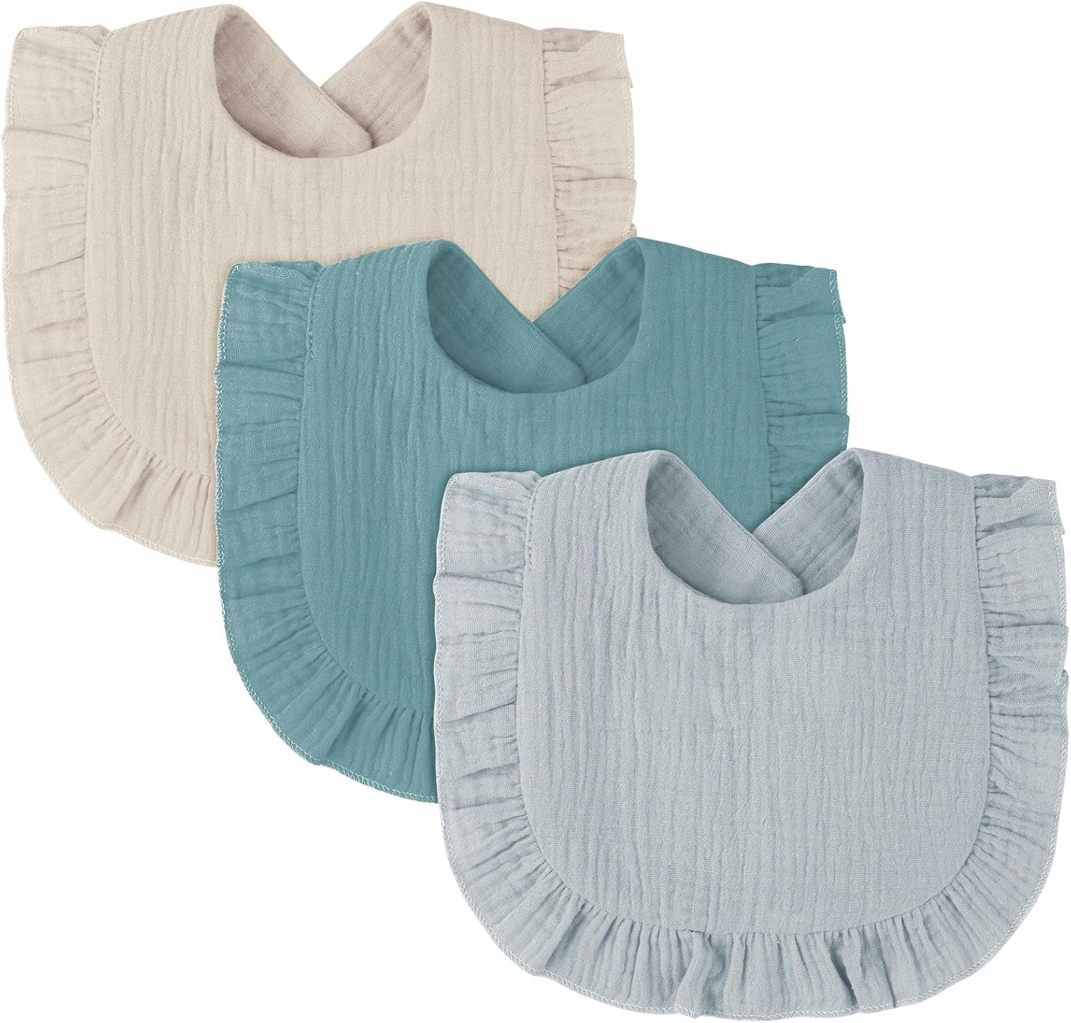 У набір входять 3 нагрудники різних кольорів, кожен із милими оборками, які підходять як для дівчаток, так і для хлопчиків. Ідеально підходить для дітей у період інтенсивного слиновиділення та прорізування зубів. Ідеальна ідея подарунка для новоспечених батьків.