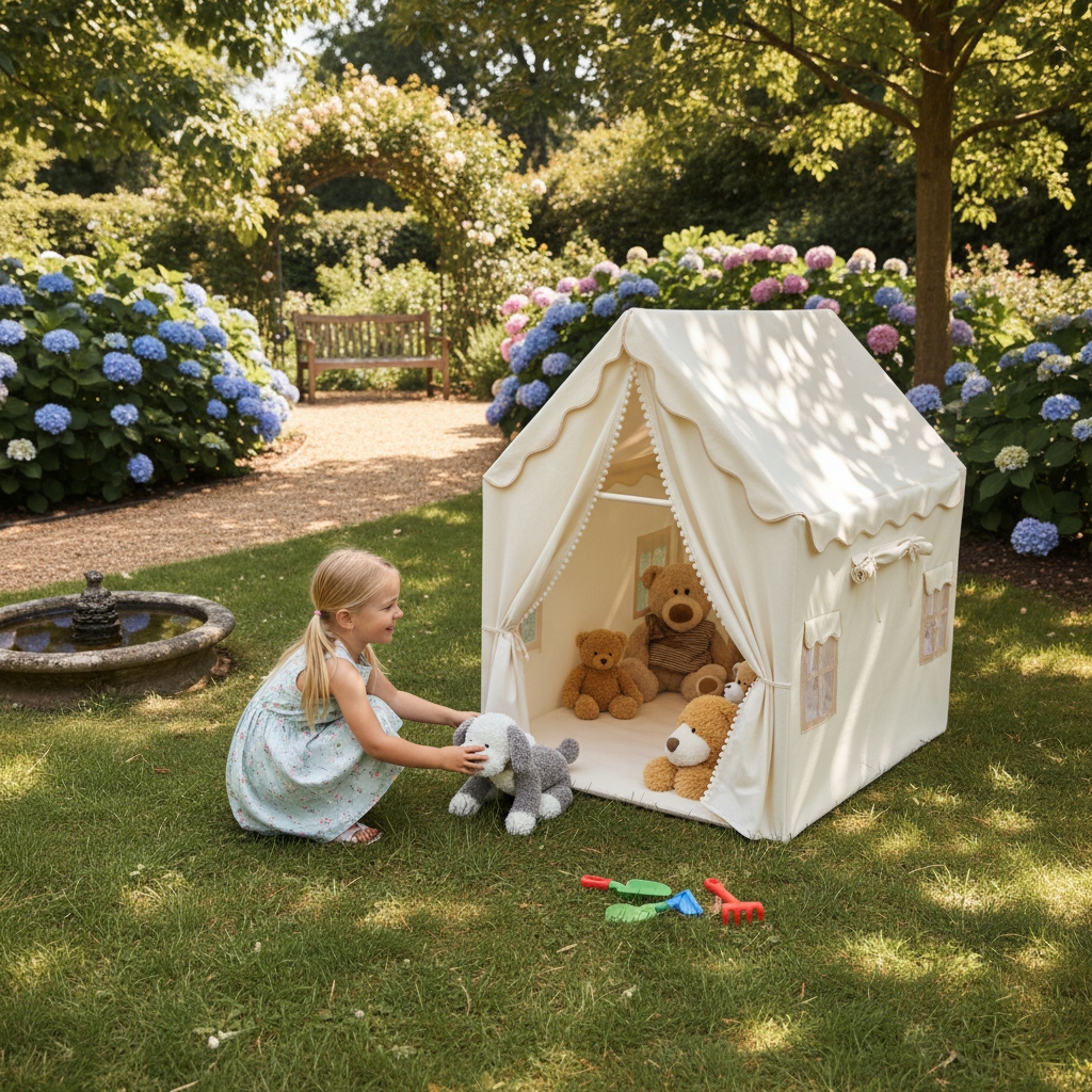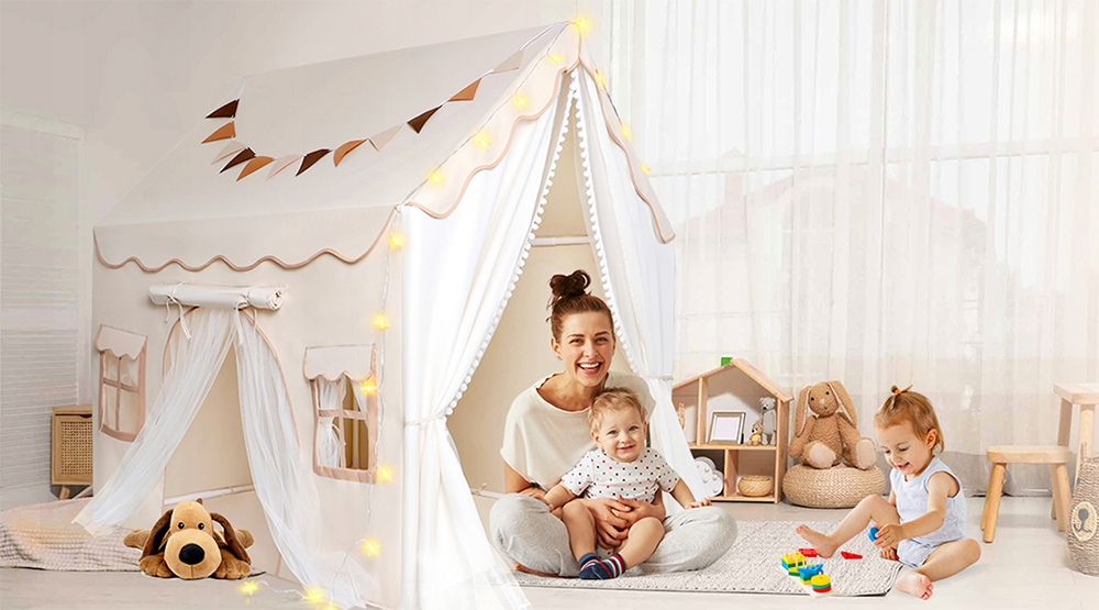Цей дитячий ігровий будиночок має двері та вікна із шторами, що робить його ідеальним місцем для рольових ігор і читання. Завдяки нейтральному стилю, який ідеально поєднується з будь-яким інтер’єром, він забезпечує дітям спокійну гавань, ідеальну для творчих ігор, читання та сну.