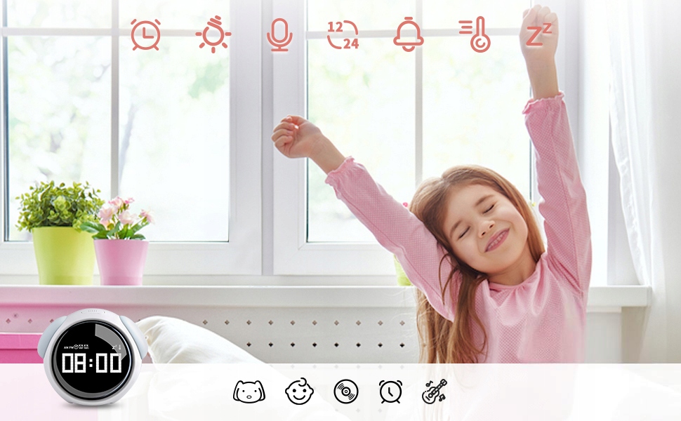 Це повністю функціональний будильник для дітей з багатьма перевагами. Як нічний будильник, він має багато функцій для різних потреб, таких як подвійні налаштування тривоги, багато варіантів дзвону, регульований об'єм, активоване нічне життя, моніторинг температури тощо. Це можна подарувати дітям як подарунок у вигляді фігур тварин. І найбільша перевага полягає в тому, що як практична іграшка, яка щодня прокидається з дитиною, менш ймовірність, що вона буде кинута дитиною через нудьгу.